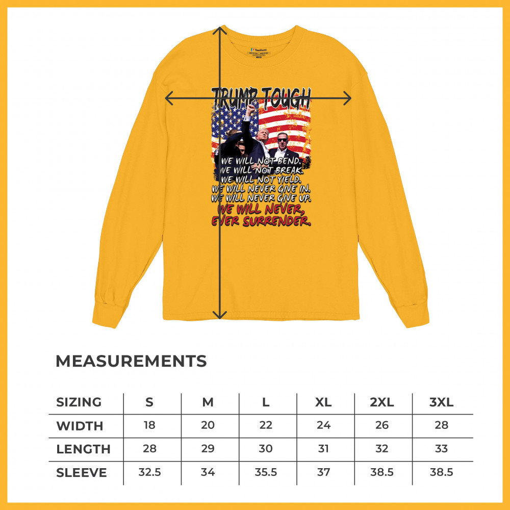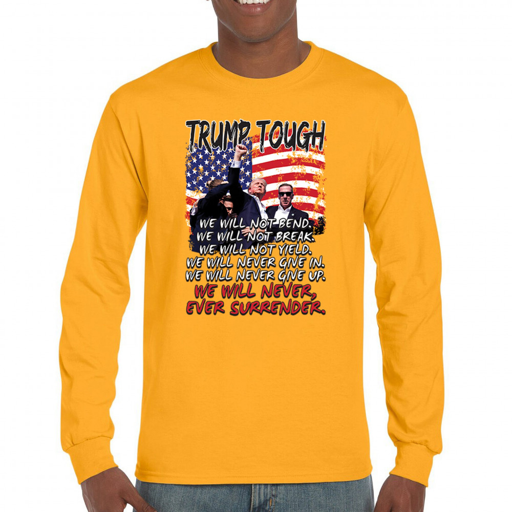 Express your support for Trump 2024 with this bold, patriotic design featuring the American flag and a powerful message. Never surrender your values.