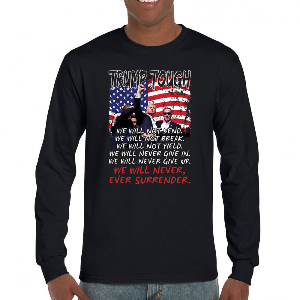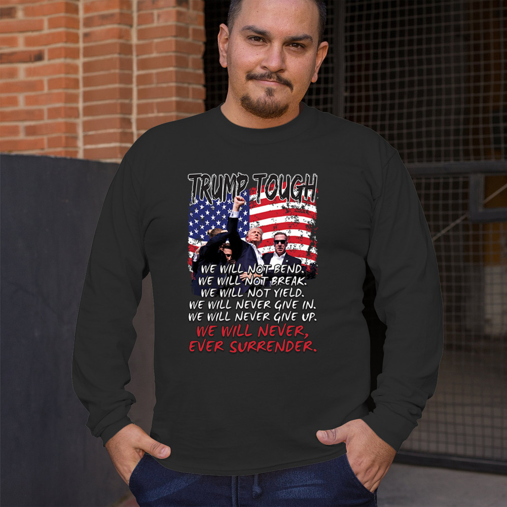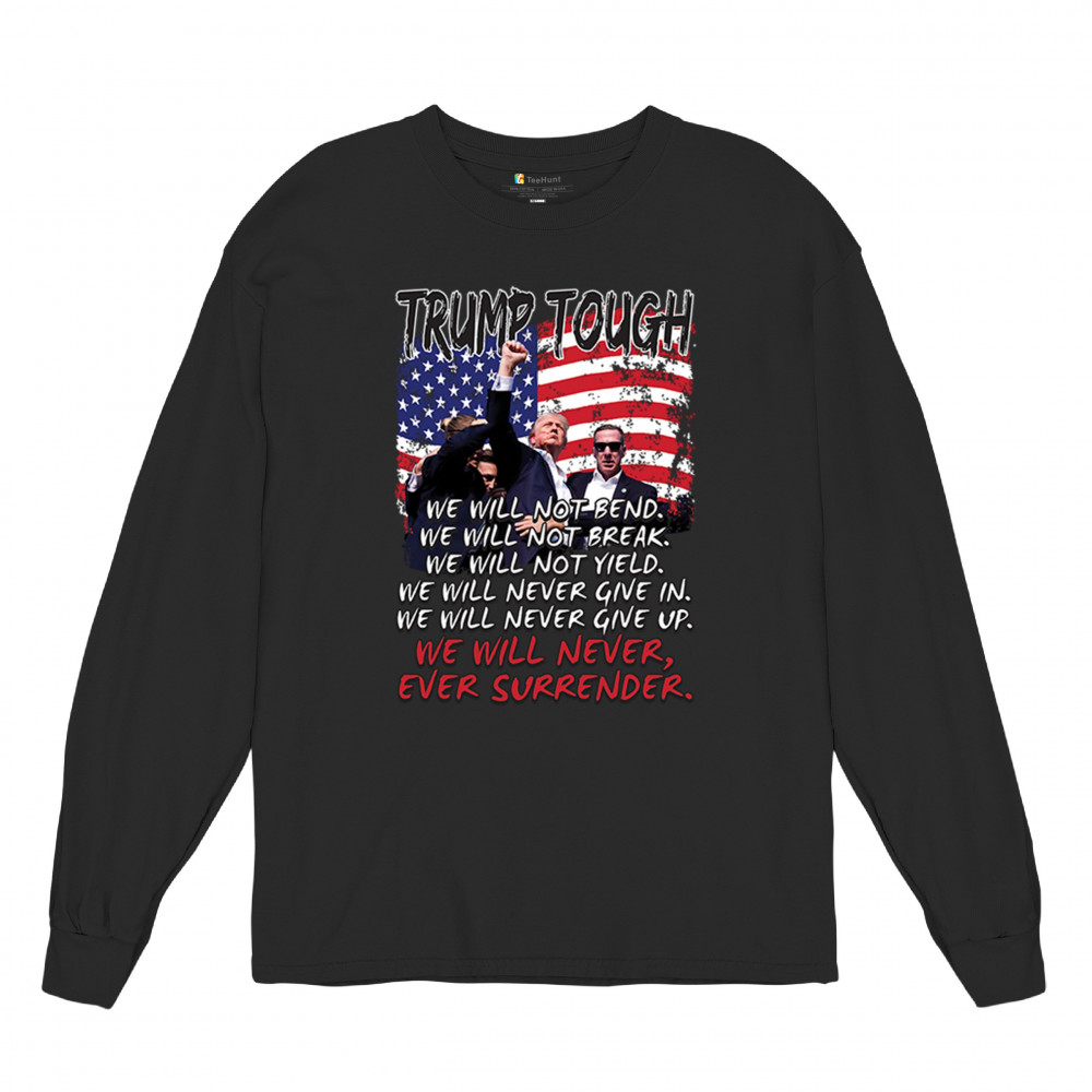 Express your support for Trump 2024 with this bold, patriotic design featuring the American flag and a powerful message. Never surrender your values.