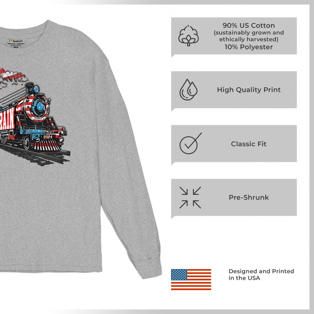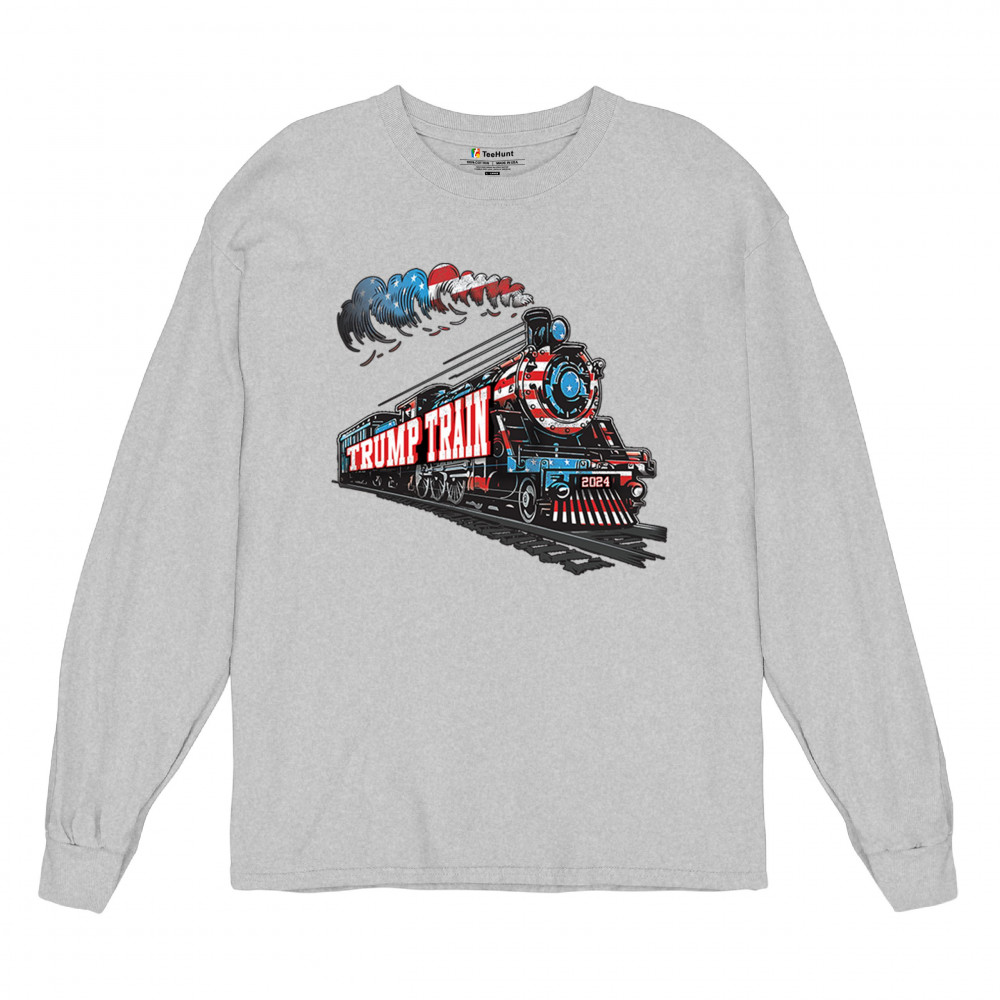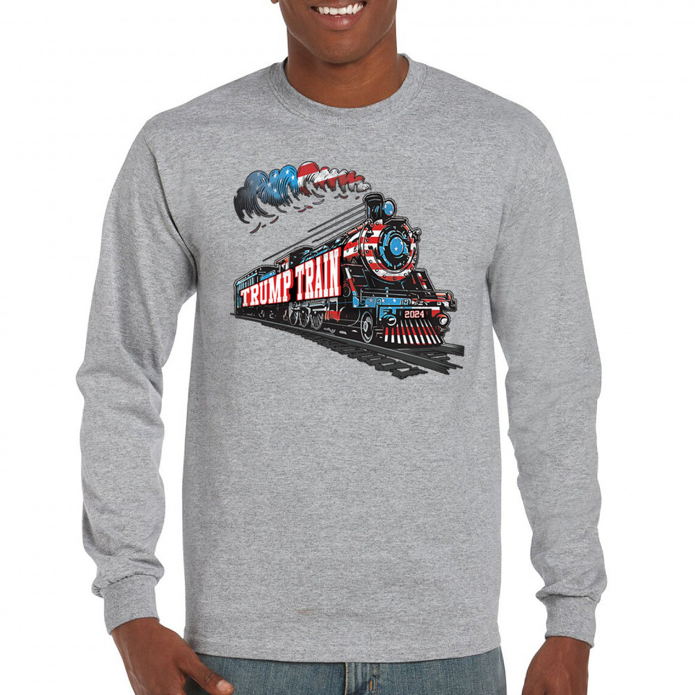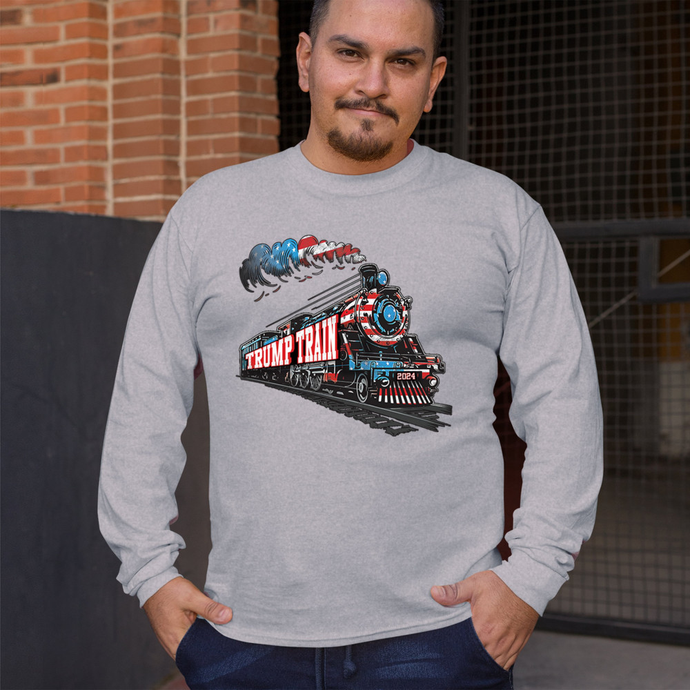 Hop on the Trump Train and support America First! This bold, patriotic tee is perfect for Republicans, conservatives, and the Red Wave movement.