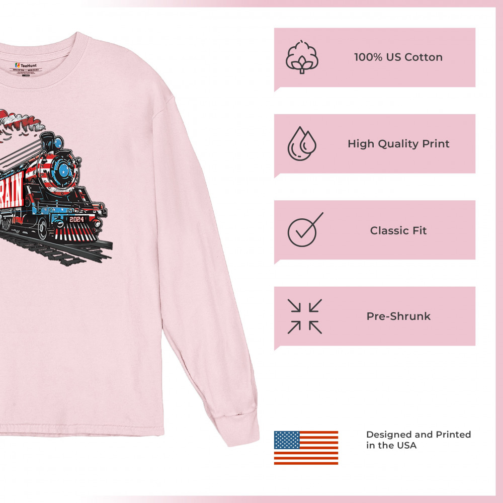 Celebrate the Trump Train with this bold, patriotic design. Featuring a steam engine wrapped in the American flag, this tee is perfect for Trump supporters and conservatives looking to make a statement. Join the Red Wave, fight for victory, and showcase your support for the 47th President. Whether at rallies or casual events, this design represents we the people have spoken and the push for 4 More Years.