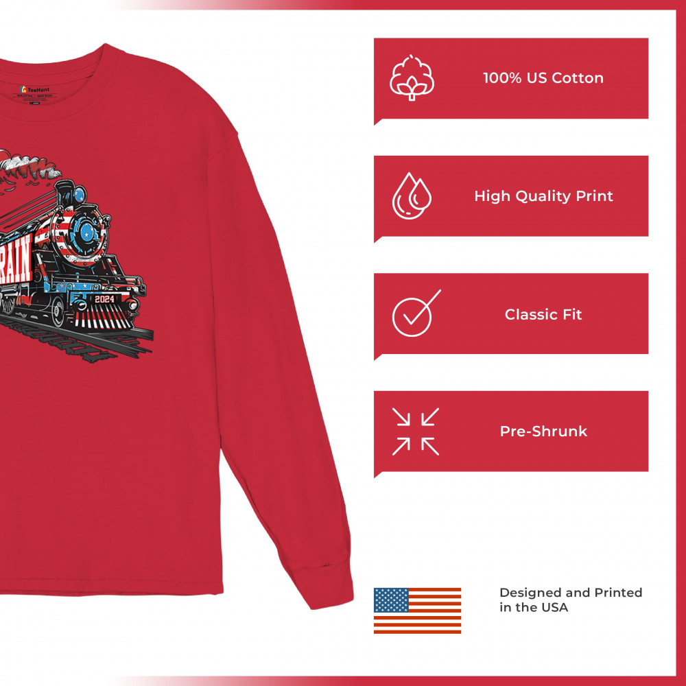 Celebrate the Trump Train with this bold, patriotic design. Featuring a steam engine wrapped in the American flag, this tee is perfect for Trump supporters and conservatives looking to make a statement. Join the Red Wave, fight for victory, and showcase your support for the 47th President. Whether at rallies or casual events, this design represents we the people have spoken and the push for 4 More Years.