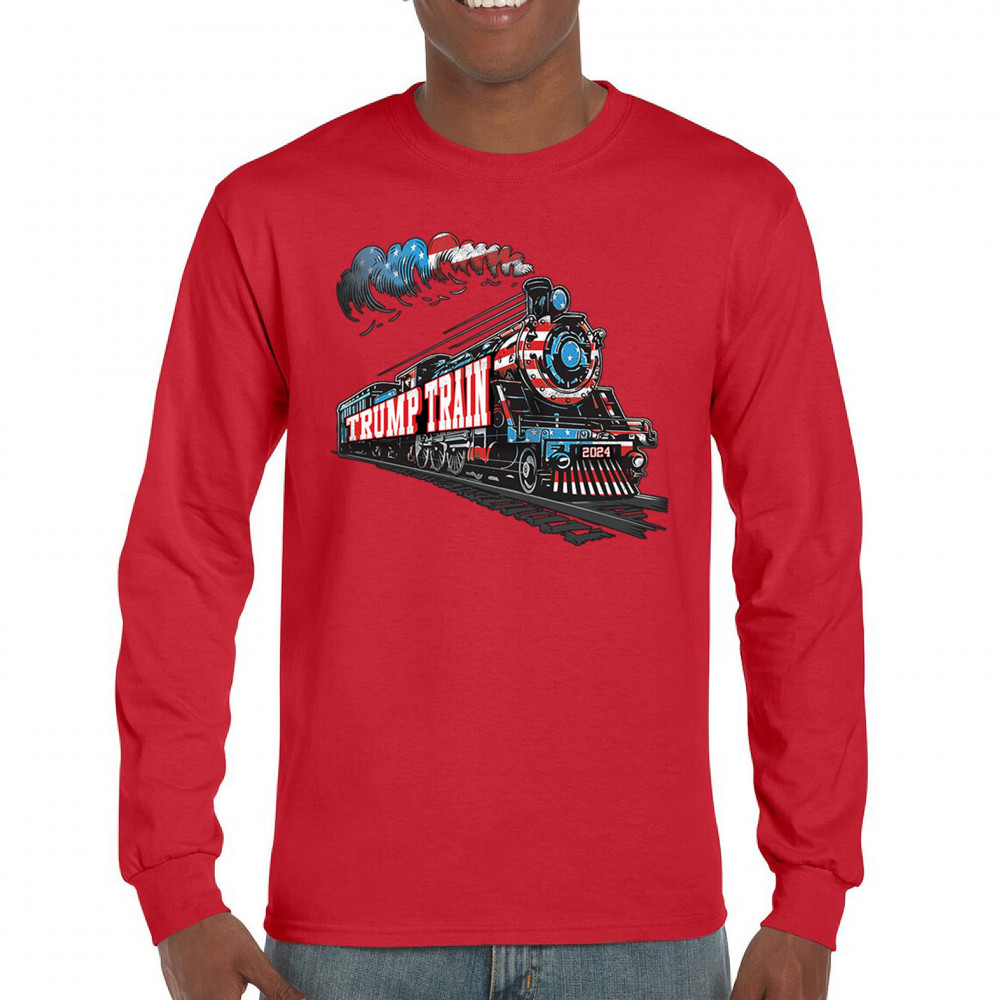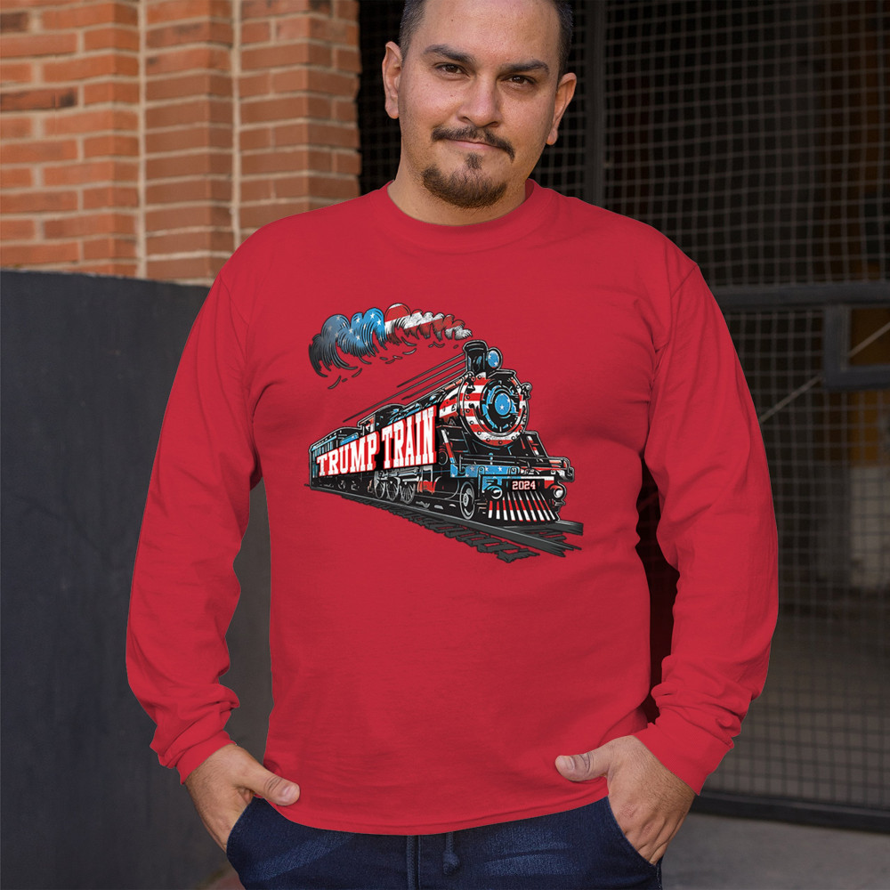 Hop on the Trump Train and support America First! This bold, patriotic tee is perfect for Republicans, conservatives, and the Red Wave movement.