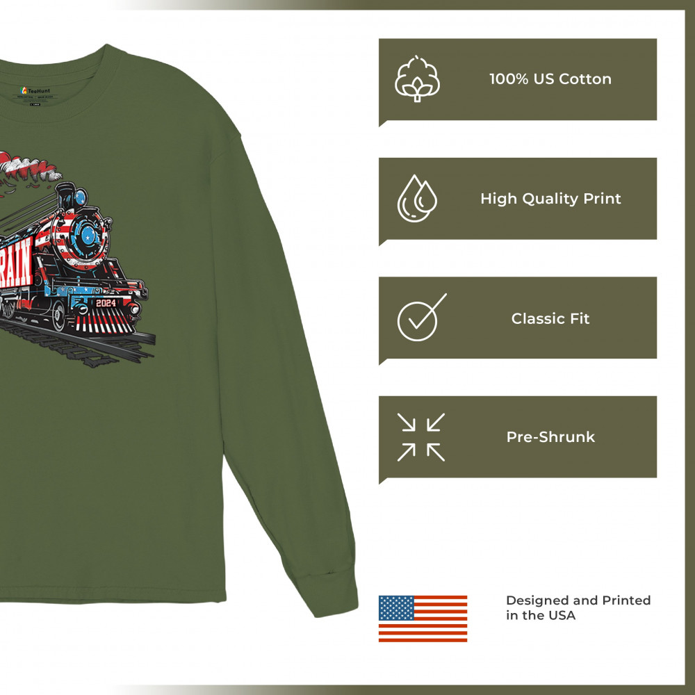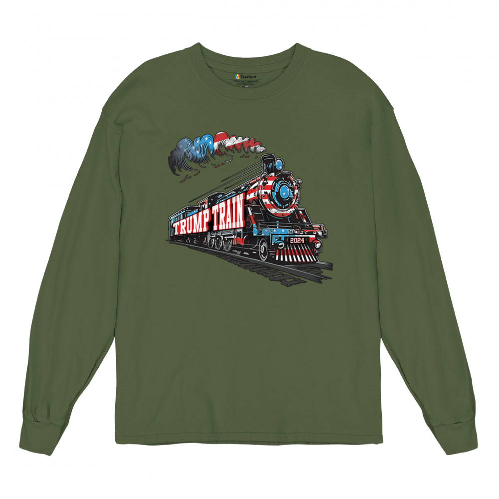 Hop on the Trump Train and support America First! This bold, patriotic tee is perfect for Republicans, conservatives, and the Red Wave movement.