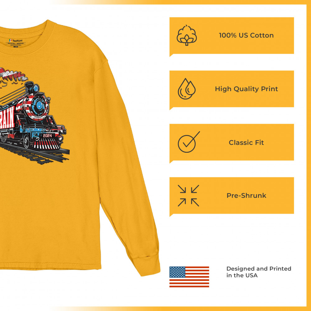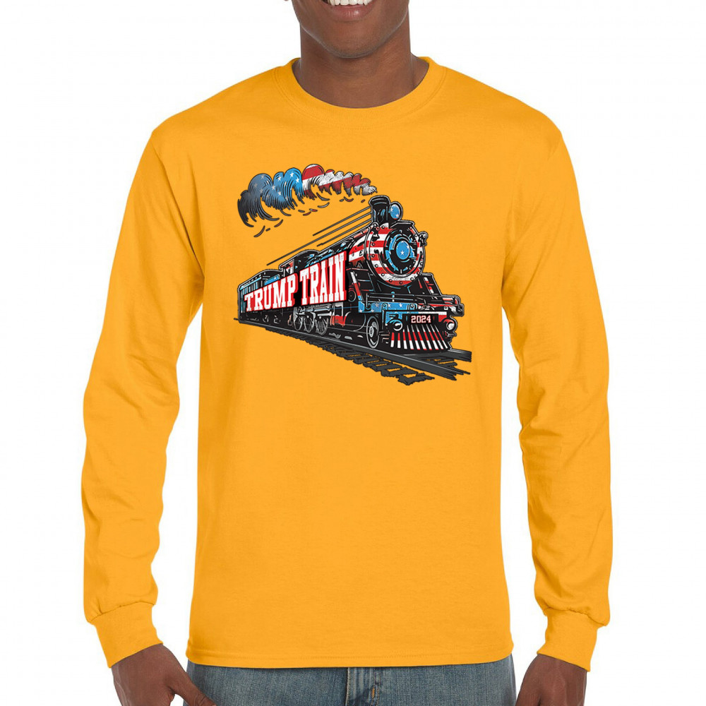Hop on the Trump Train and support America First! This bold, patriotic tee is perfect for Republicans, conservatives, and the Red Wave movement.