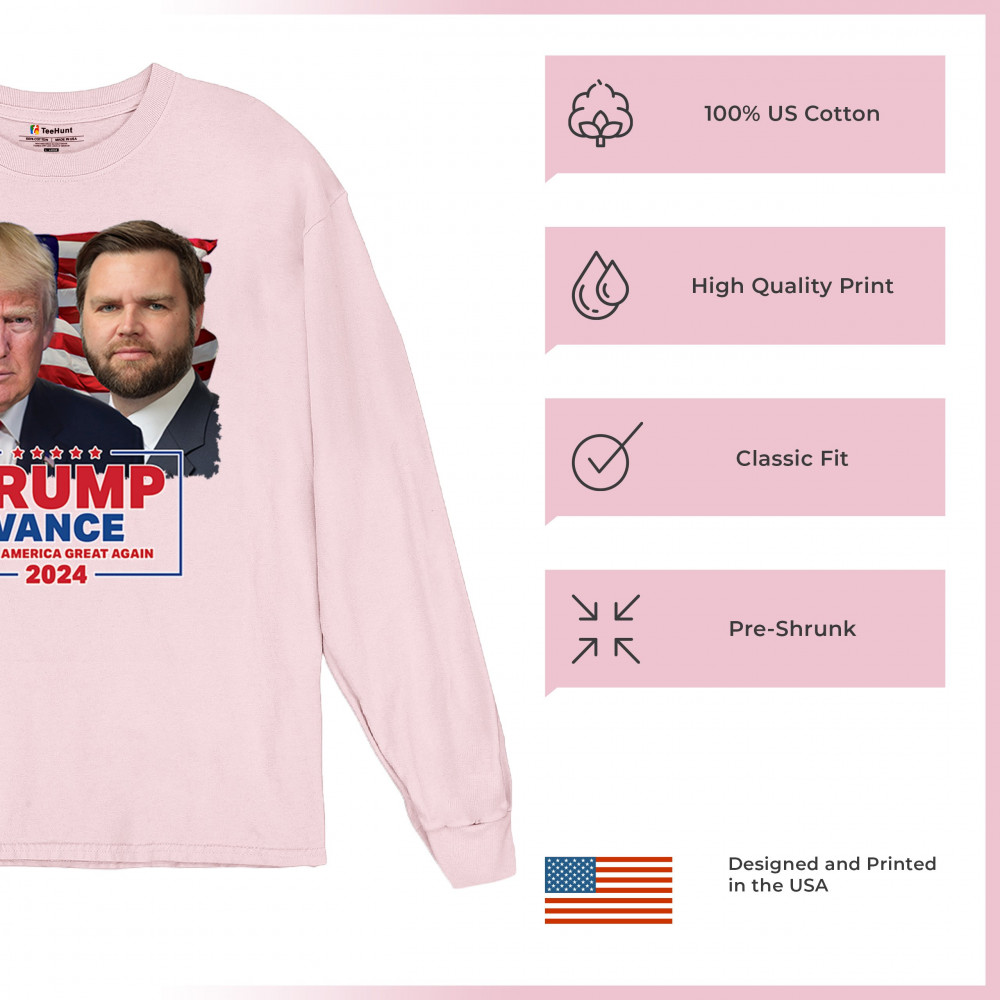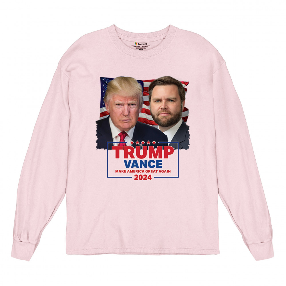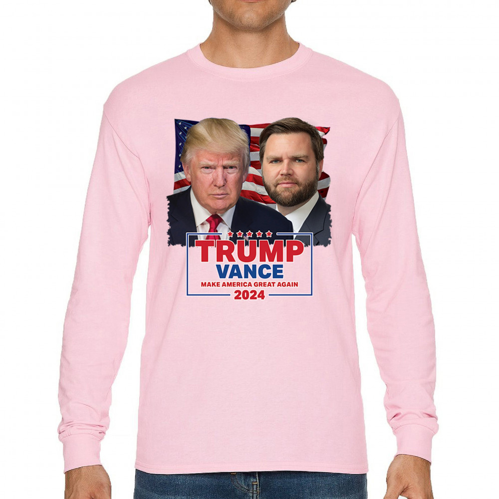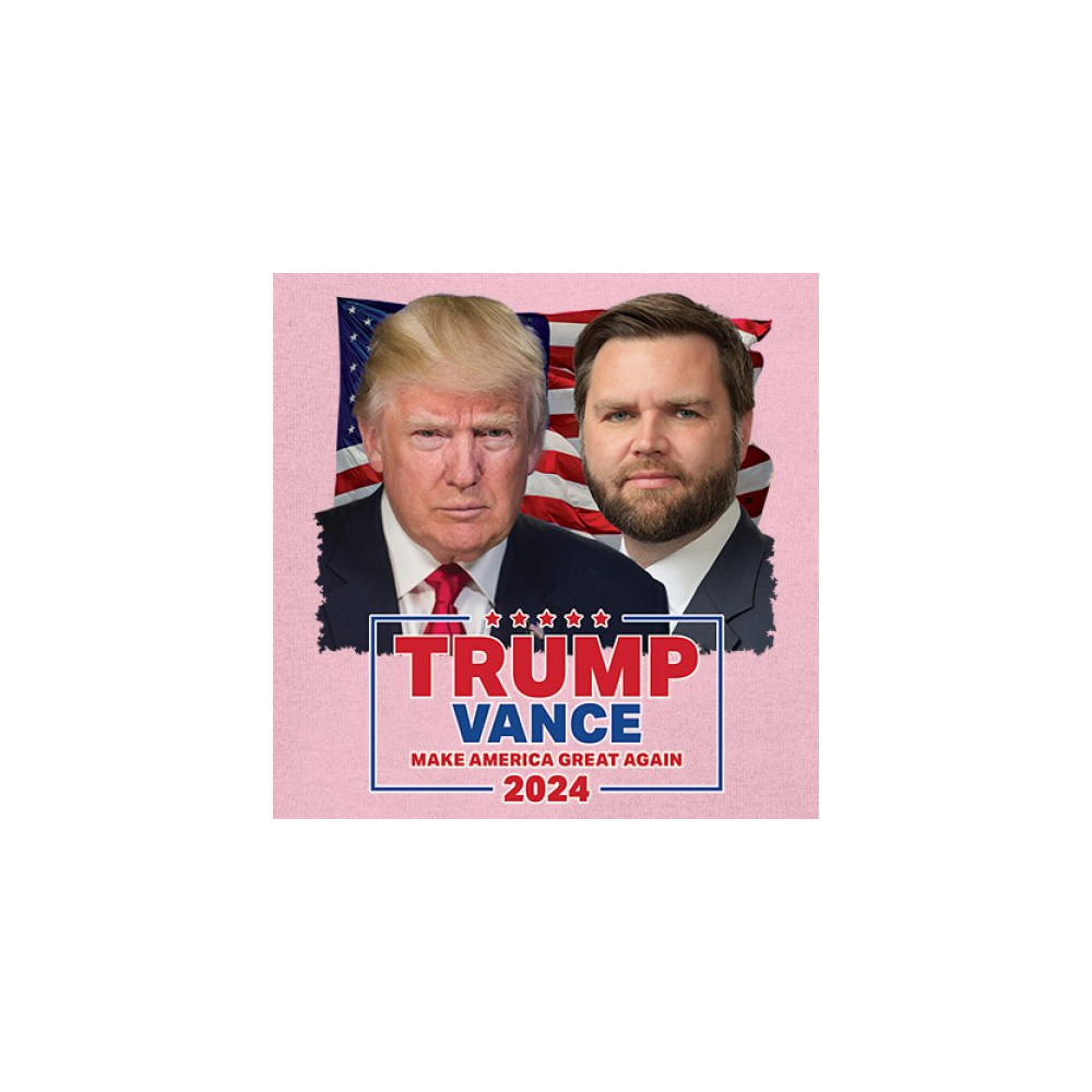 Show your support for Trump-Vance 2024 with this bold design featuring Trump and Vance against the American flag. Perfect for rallies and political events.