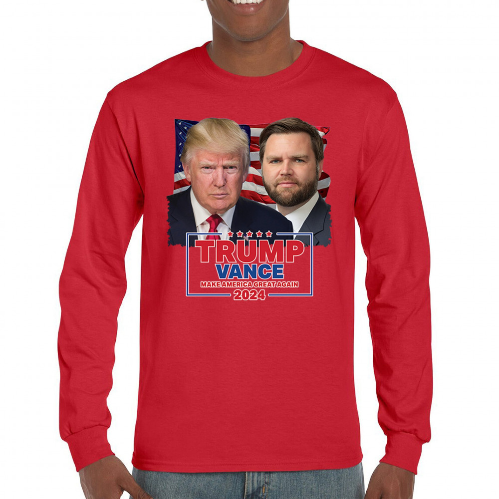 Show your support for Trump-Vance 2024 with this bold design featuring Trump and Vance against the American flag. Perfect for rallies and political events.