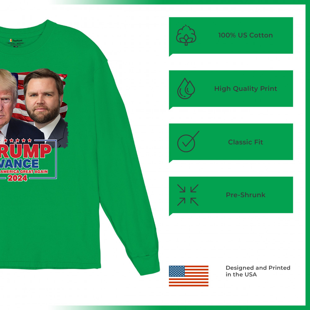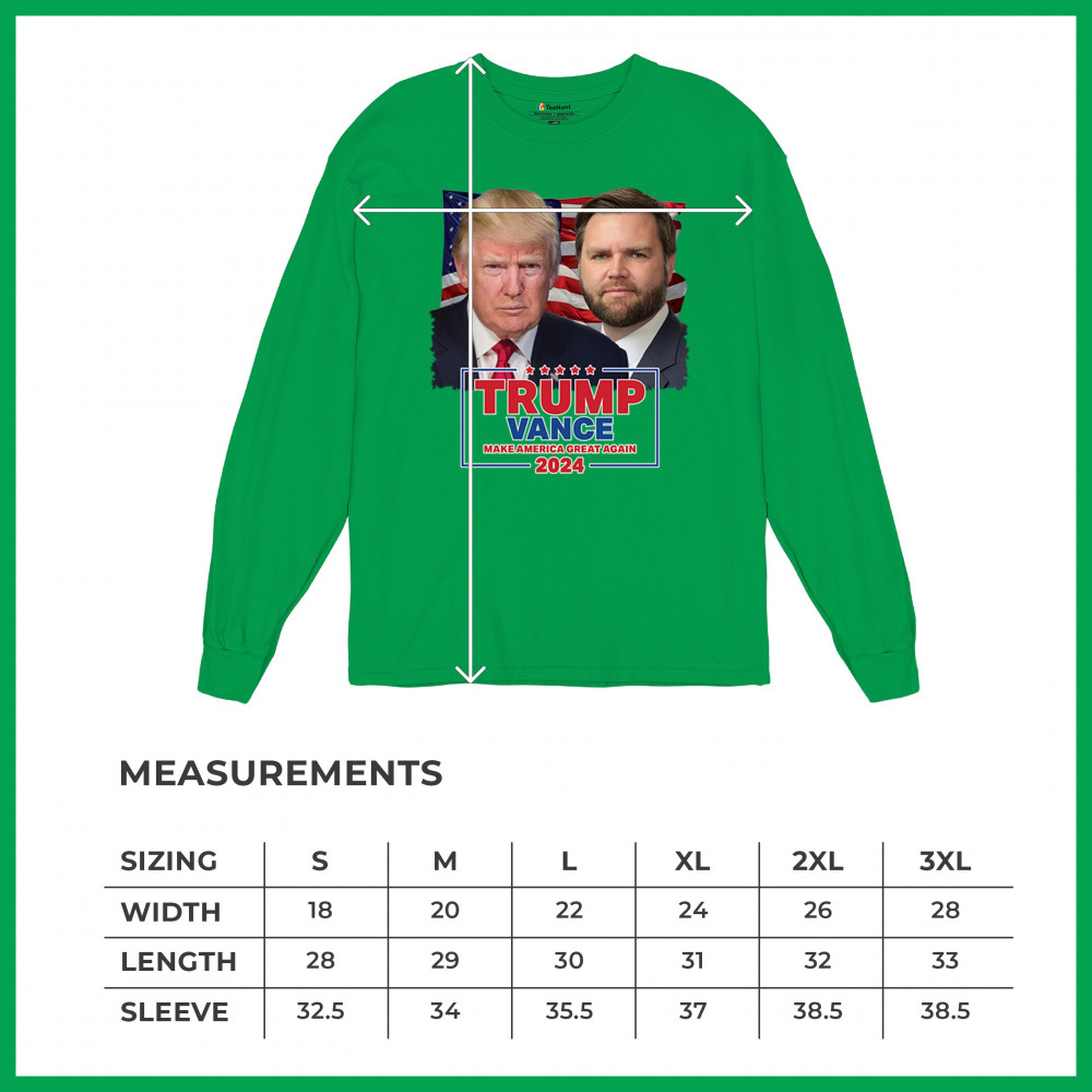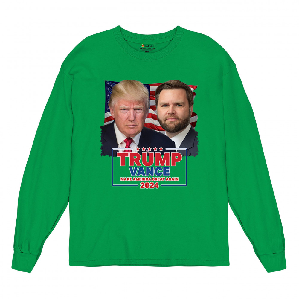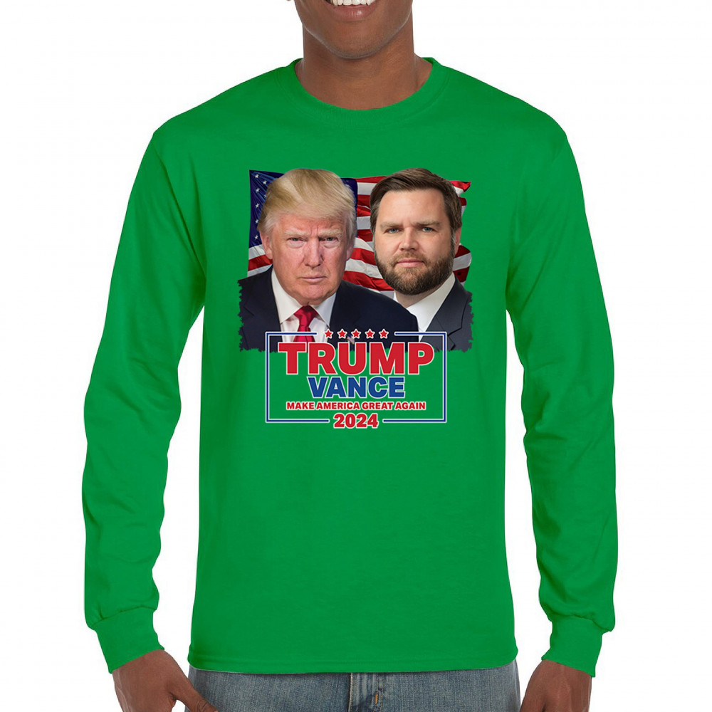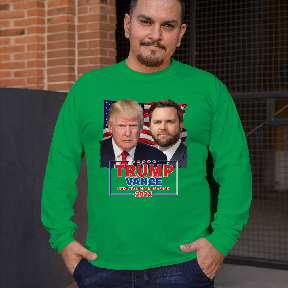 Show your support for Trump-Vance 2024 with this bold design featuring Trump and Vance against the American flag. Perfect for rallies and political events.