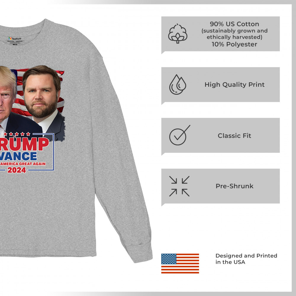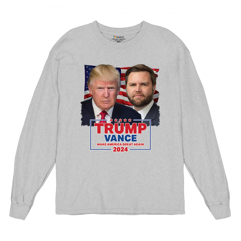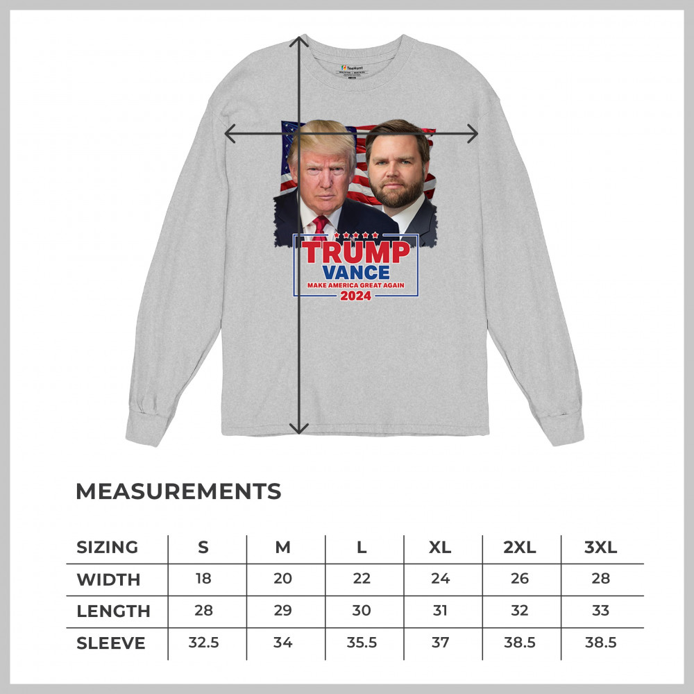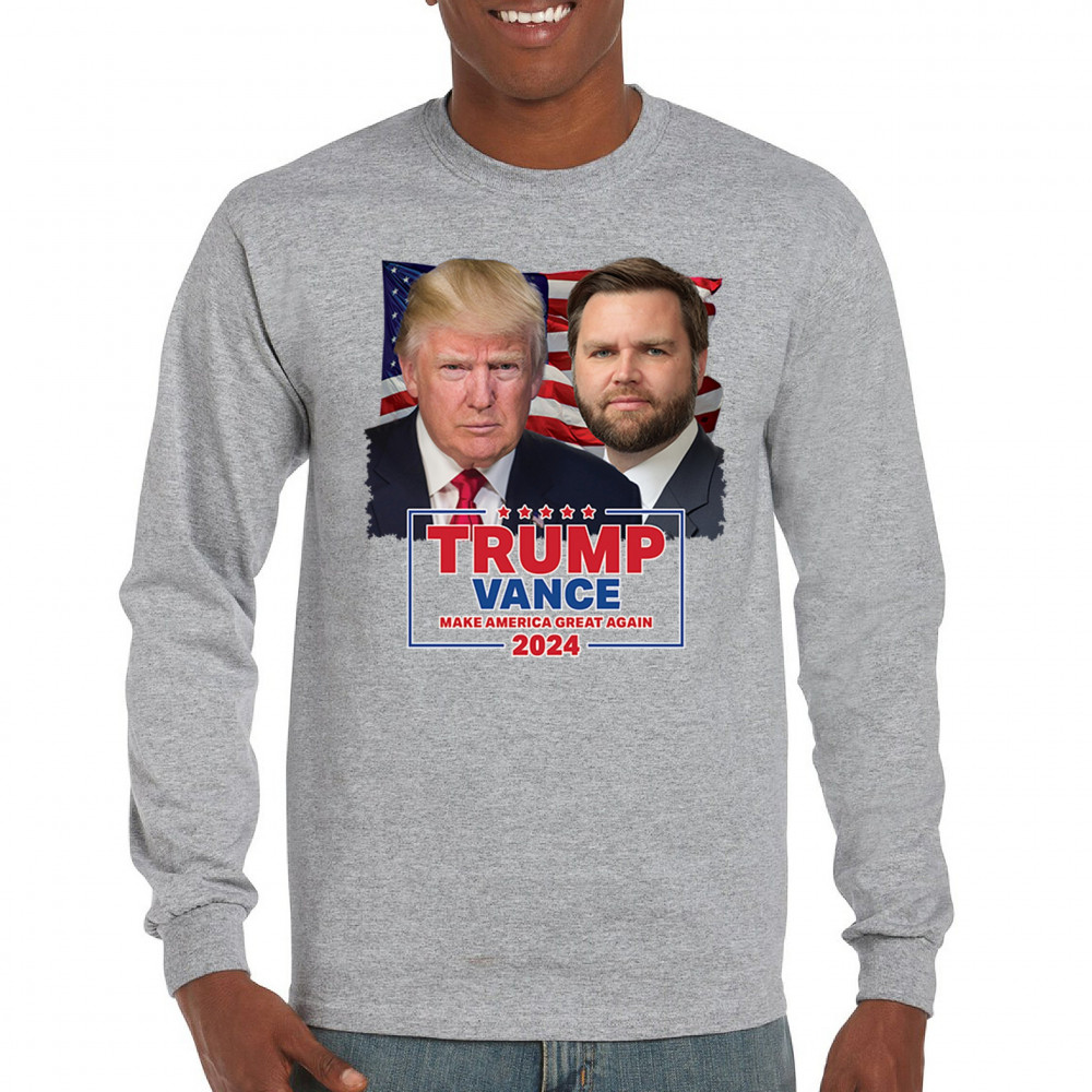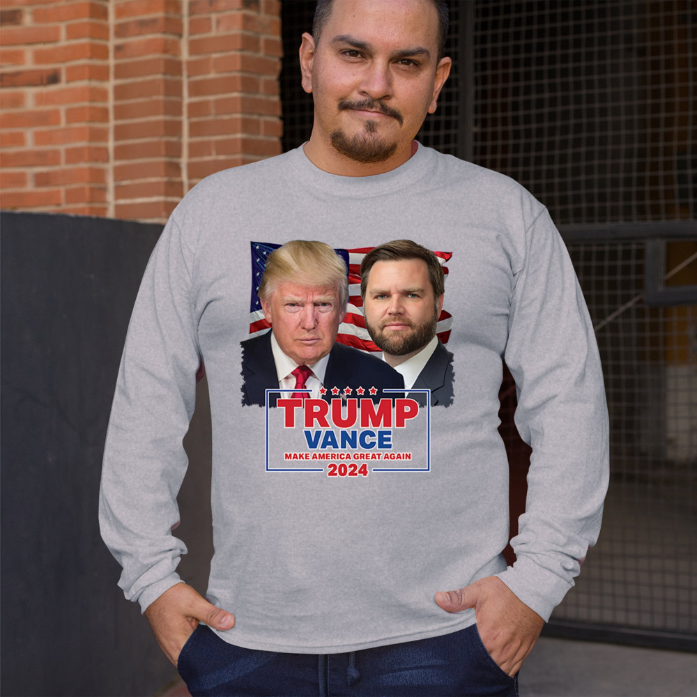 Show your support for Trump-Vance 2024 with this bold design featuring Trump and Vance against the American flag. Perfect for rallies and political events.