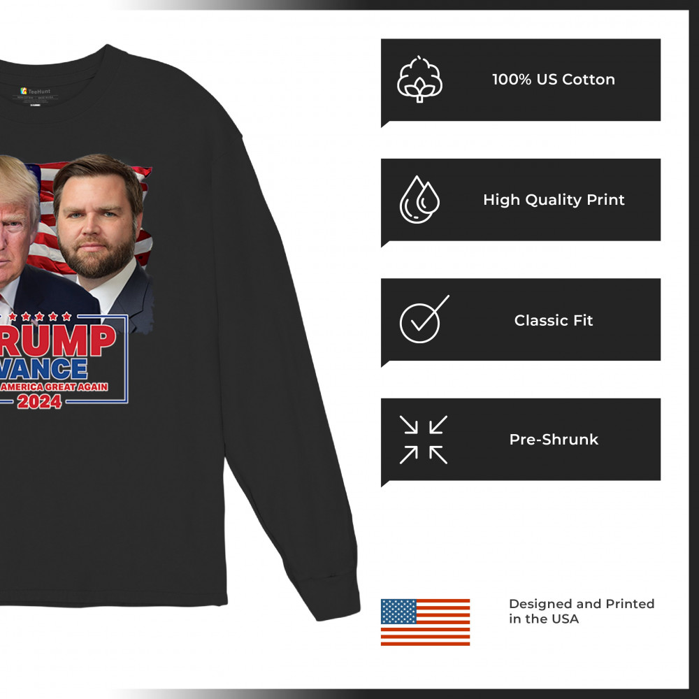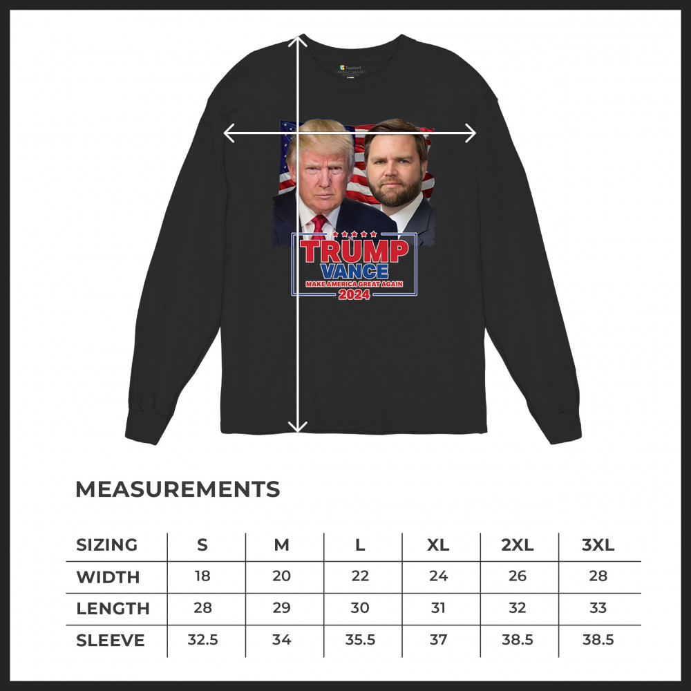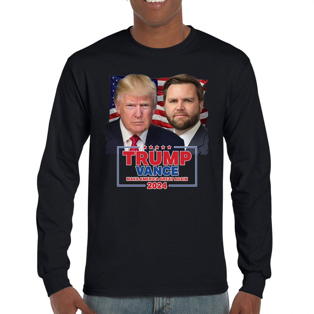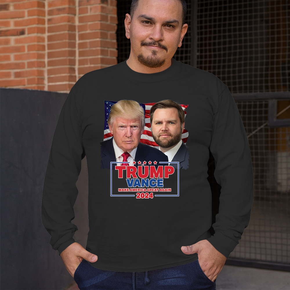 Show your support for Trump-Vance 2024 with this bold design featuring Trump and Vance against the American flag. Perfect for rallies and political events.
