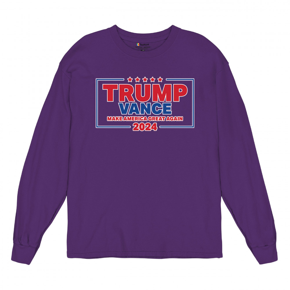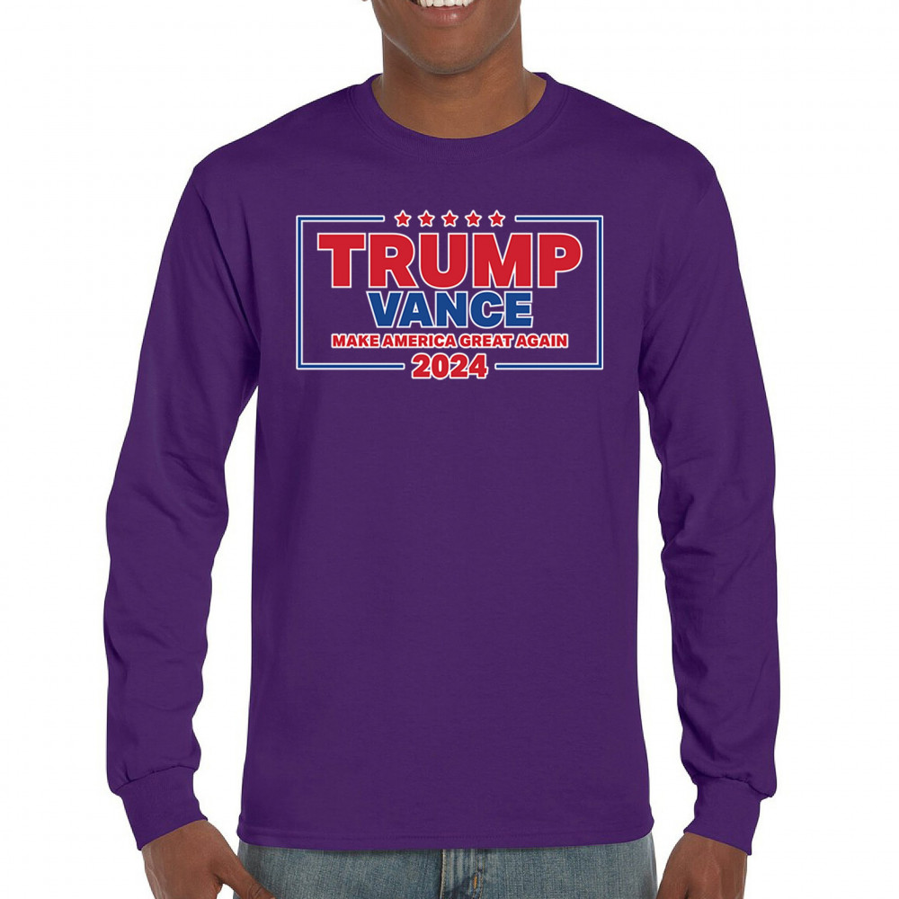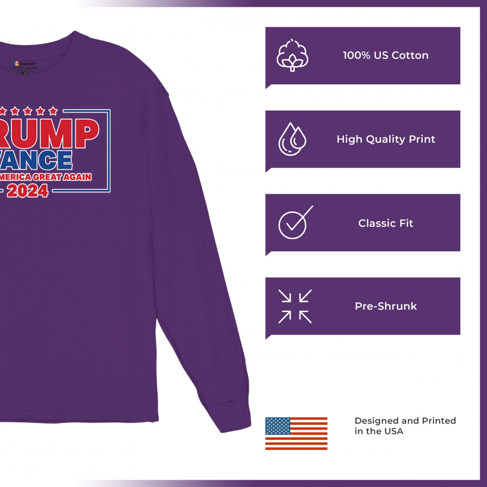 Show your support for Trump-Vance 2024 with this patriotic design featuring the American flag and bold slogan. Perfect for rallies and conservative events.