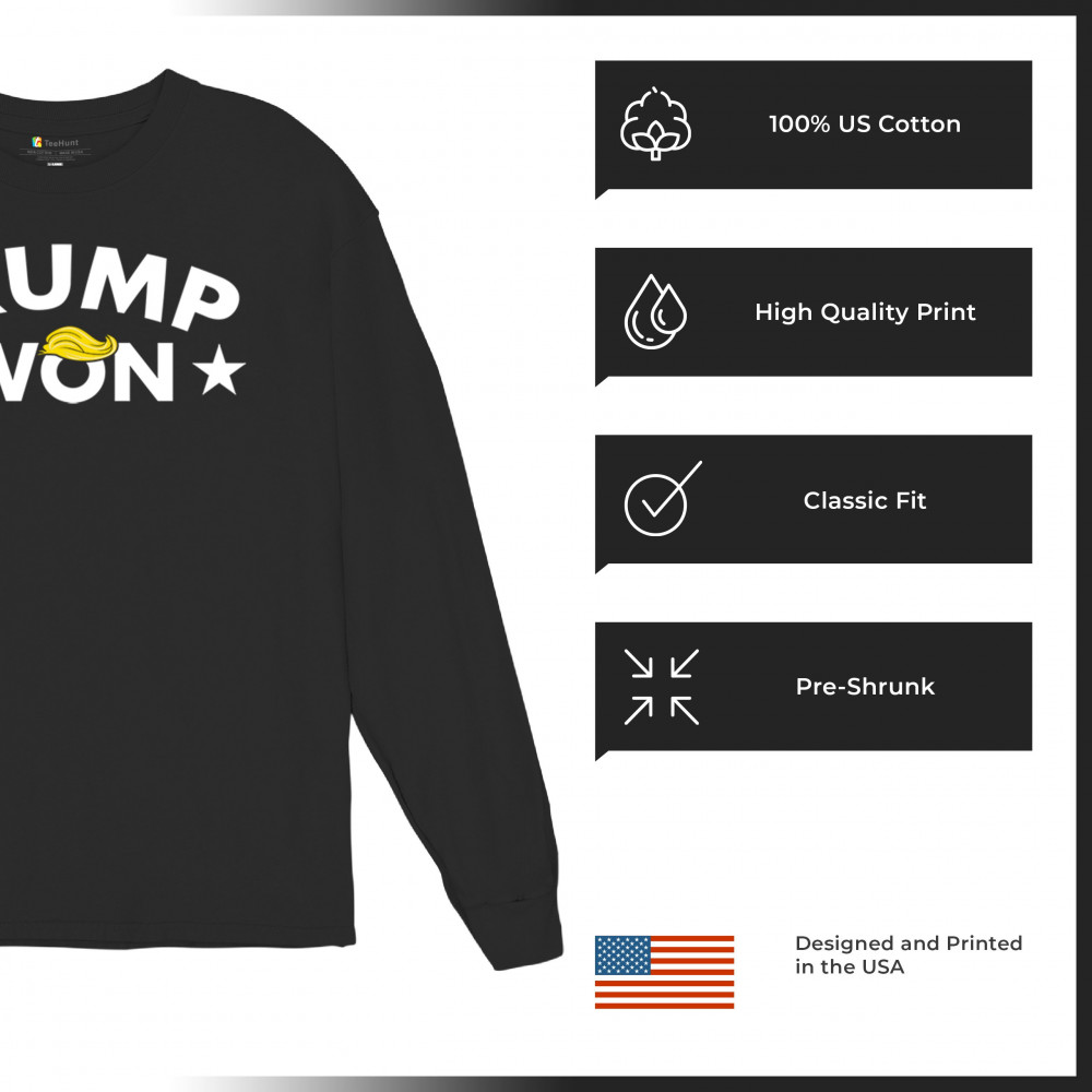 The "Trump Won" design boldly represents the spirit of victory, resilience, and unwavering support for America First principles. Ideal for patriots, Republicans, and supporters of Donald J. Trump, this statement graphic captures the momentum of the Red Wave and the people's mandate. Make your voice heard and show your dedication to the fight for freedom with this iconic design.