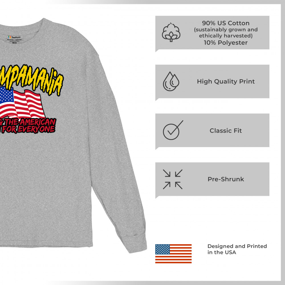 Show your patriotic pride with the "Trumpamania" design. Perfect for rallies, it embodies conservatism, trust in God, and the fight for America.