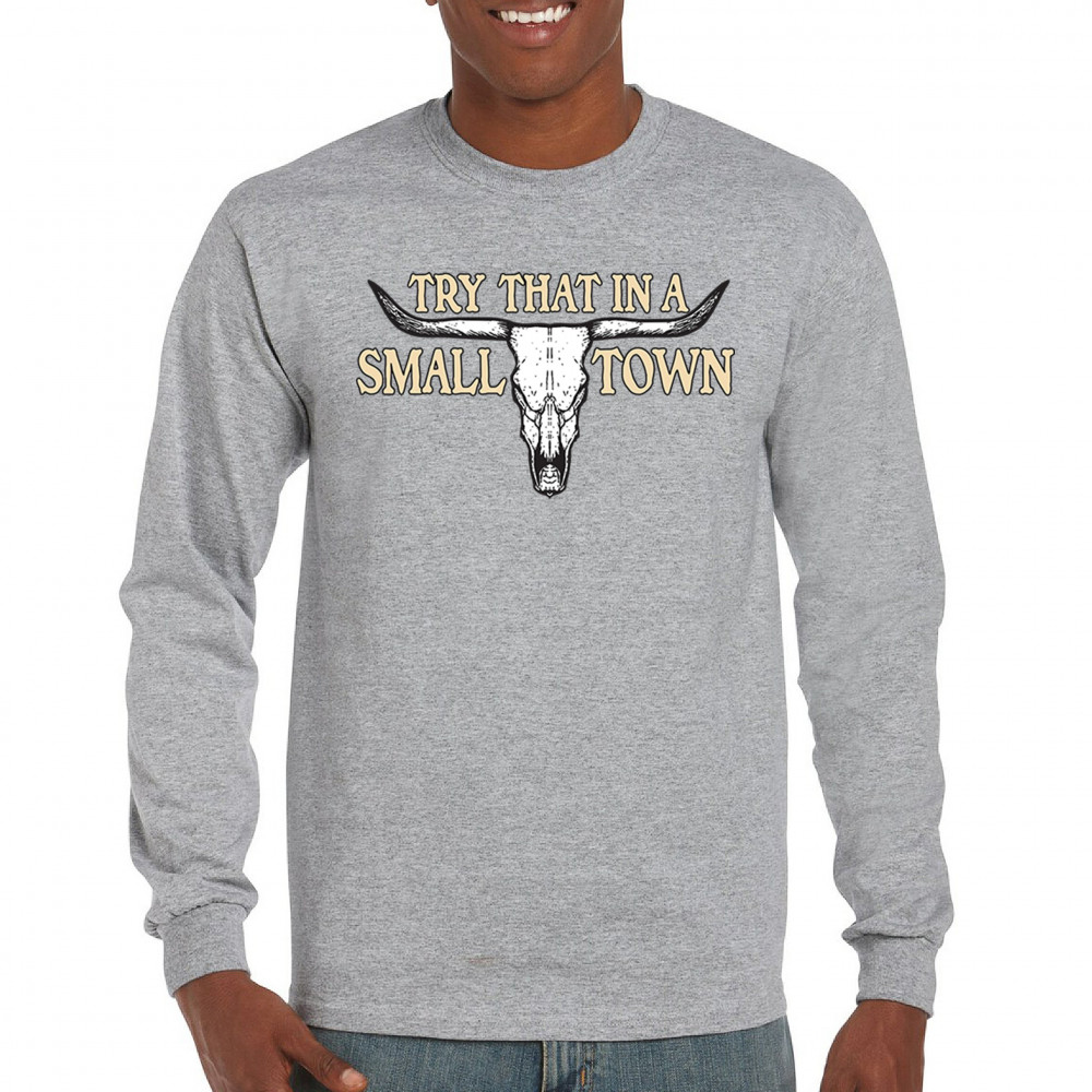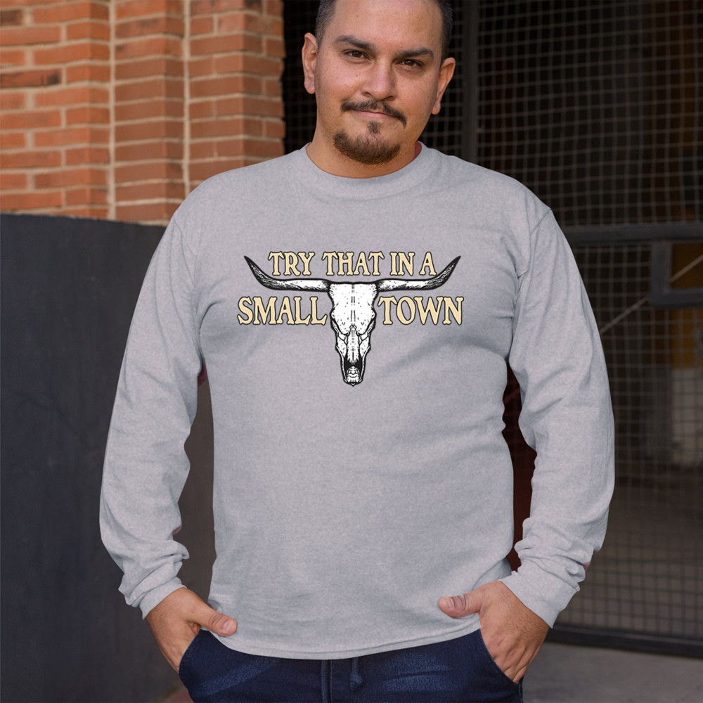 This design boldly proclaims "Try That in a SMALL TOWN," set against the backdrop of a stark cattle skull—a symbol deeply rooted in southern heritage and the undying American spirit. It's a tribute to the small-town sheriffs, the unwritten laws of backbone and duty, and the patriotic fervor that runs through the country's veins. Whether you're a motorcycle enthusiast, a Republican, or simply a connoisseur of all things vintage, this piece is a testament to enduring strength and local pride.