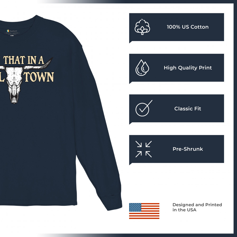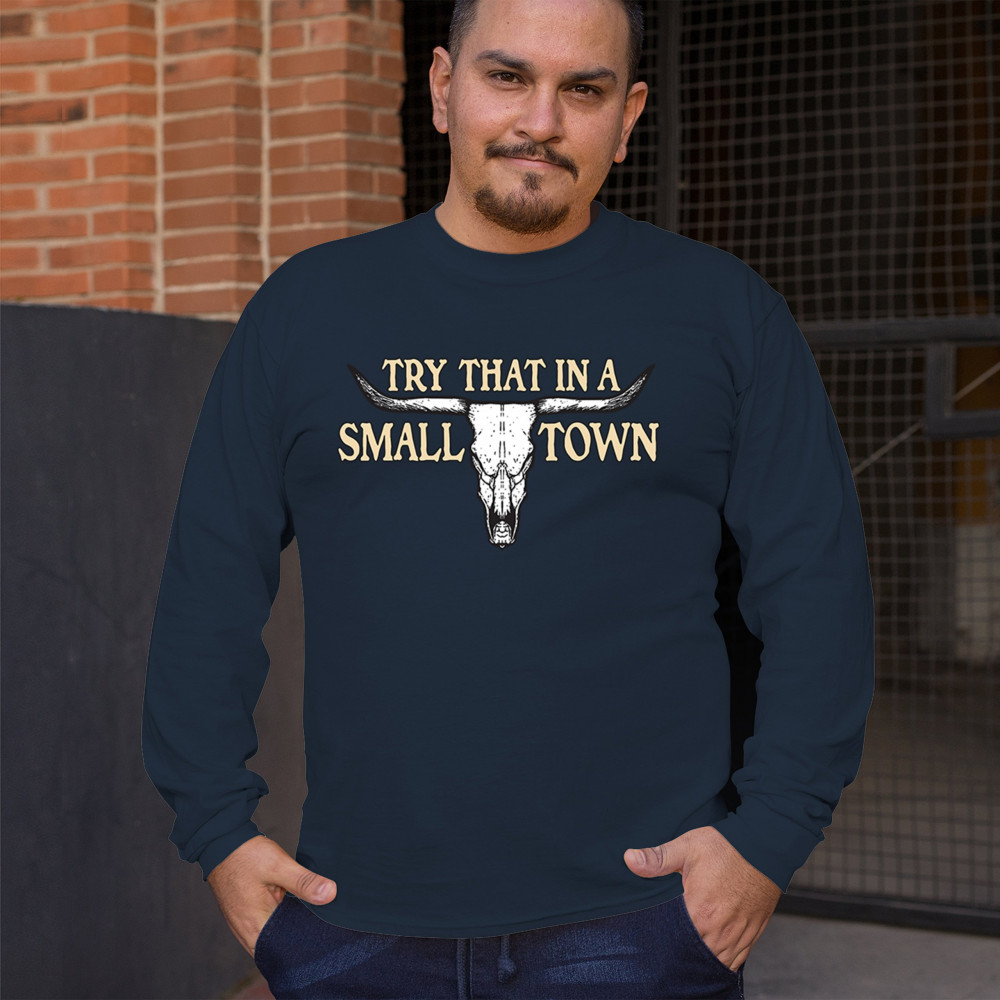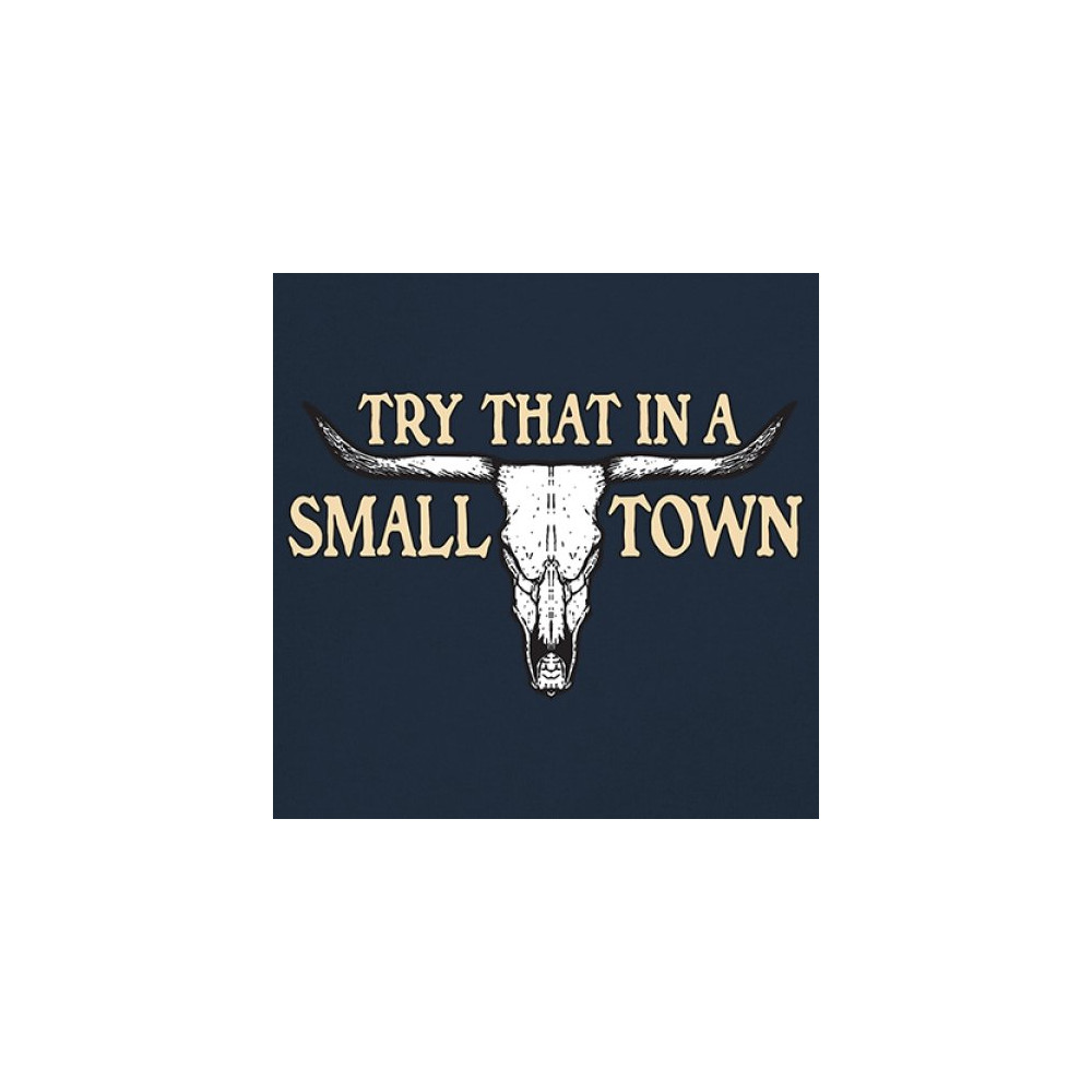 This design boldly proclaims "Try That in a SMALL TOWN," set against the backdrop of a stark cattle skull—a symbol deeply rooted in southern heritage and the undying American spirit. It's a tribute to the small-town sheriffs, the unwritten laws of backbone and duty, and the patriotic fervor that runs through the country's veins. Whether you're a motorcycle enthusiast, a Republican, or simply a connoisseur of all things vintage, this piece is a testament to enduring strength and local pride.