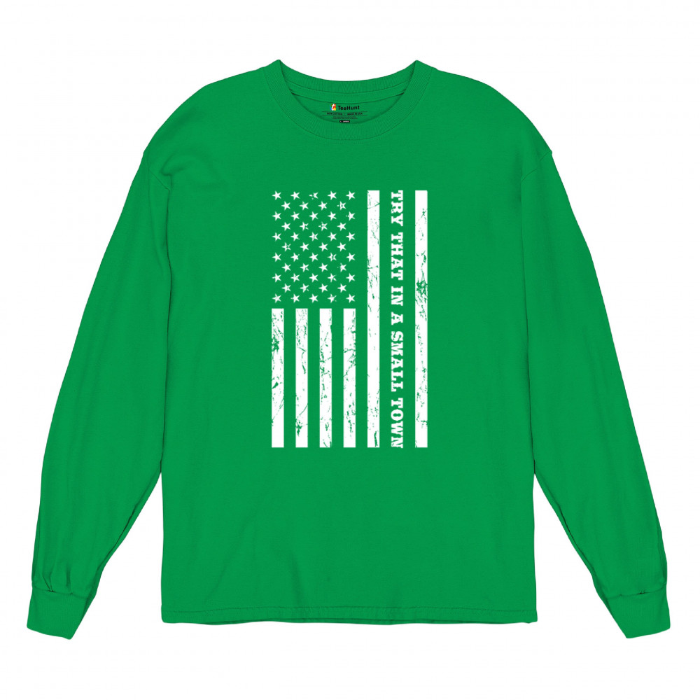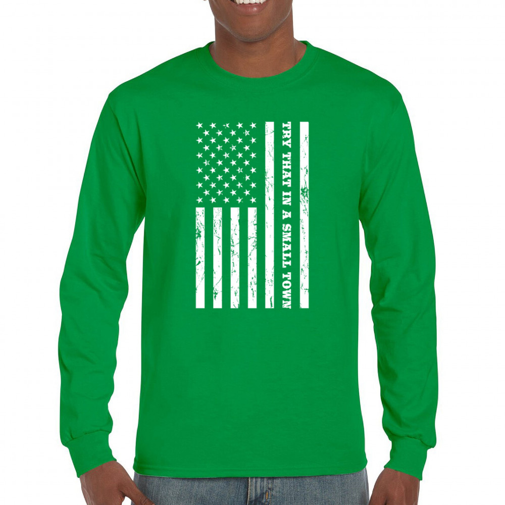TRY THAT IN A SMALL TOWN GRUNGE AMERICAN FLAG long sleeve t-shirt patriotic green