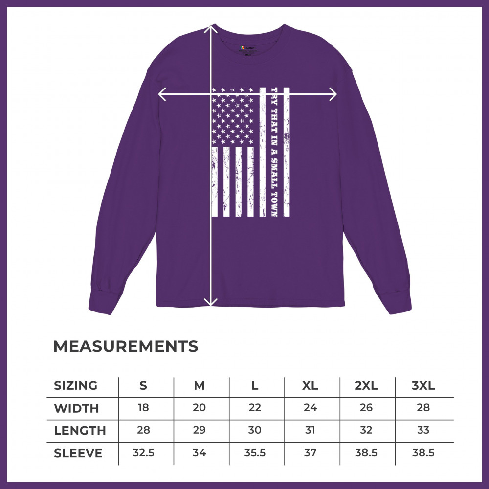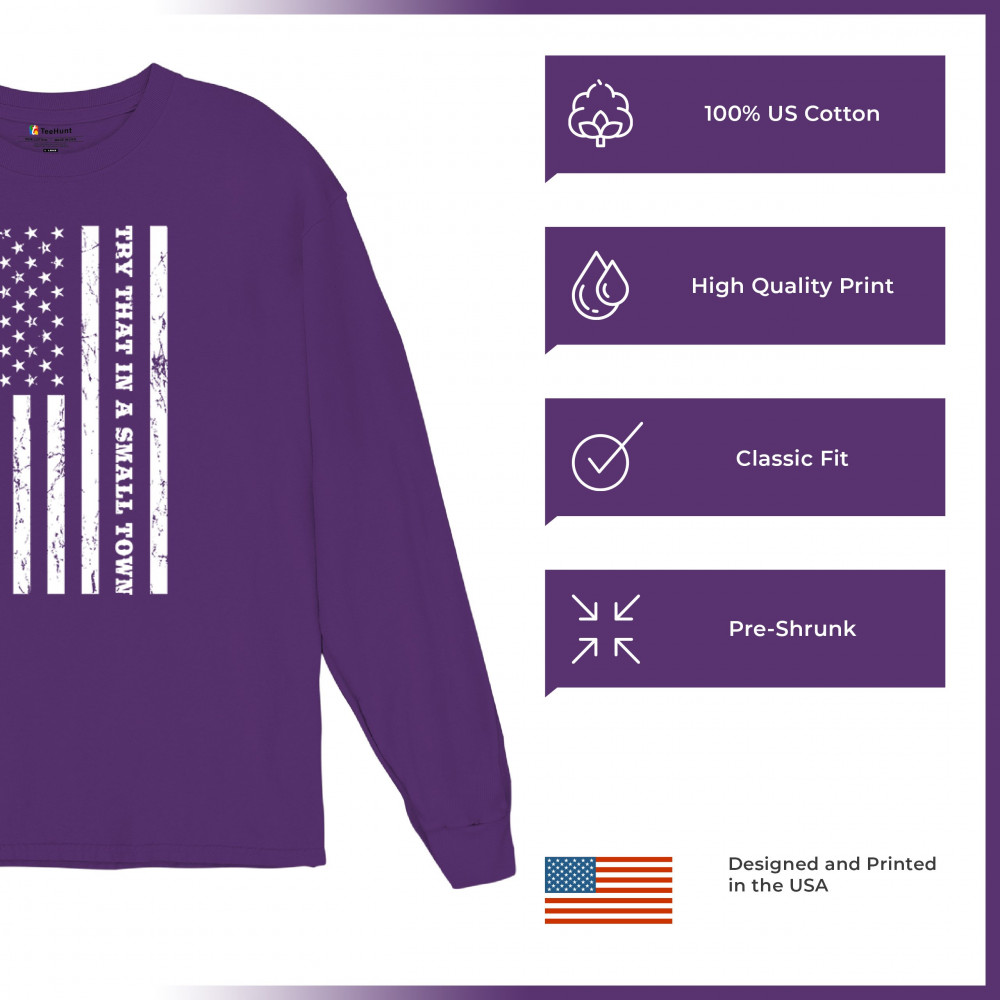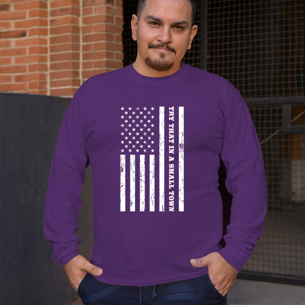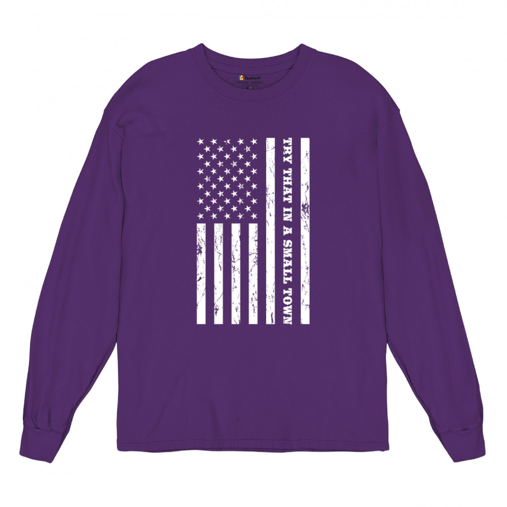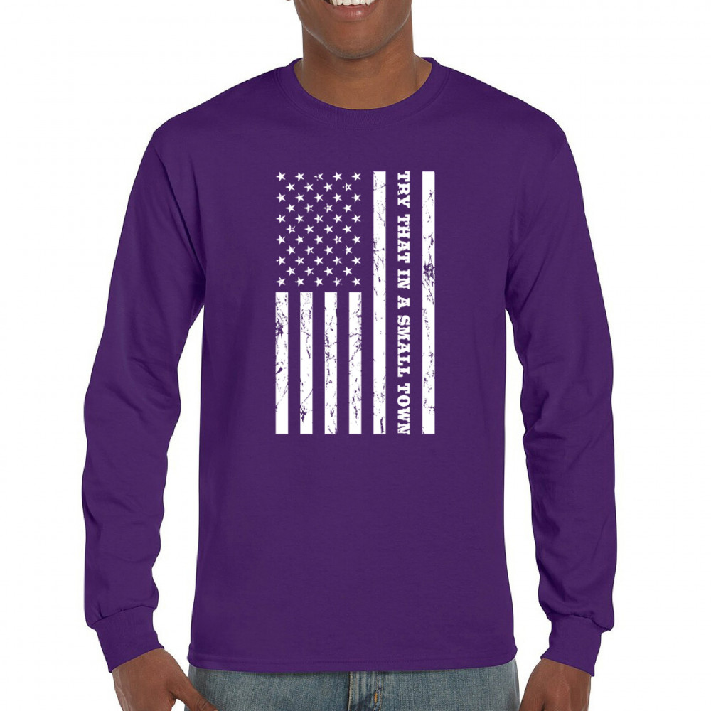 TRY THAT IN A SMALL TOWN GRUNGE AMERICAN FLAG long sleeve t-shirt patriotic purple