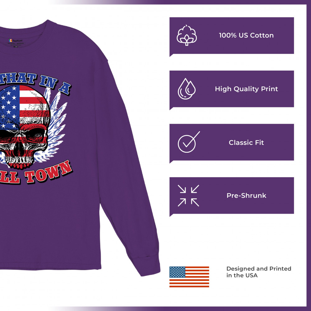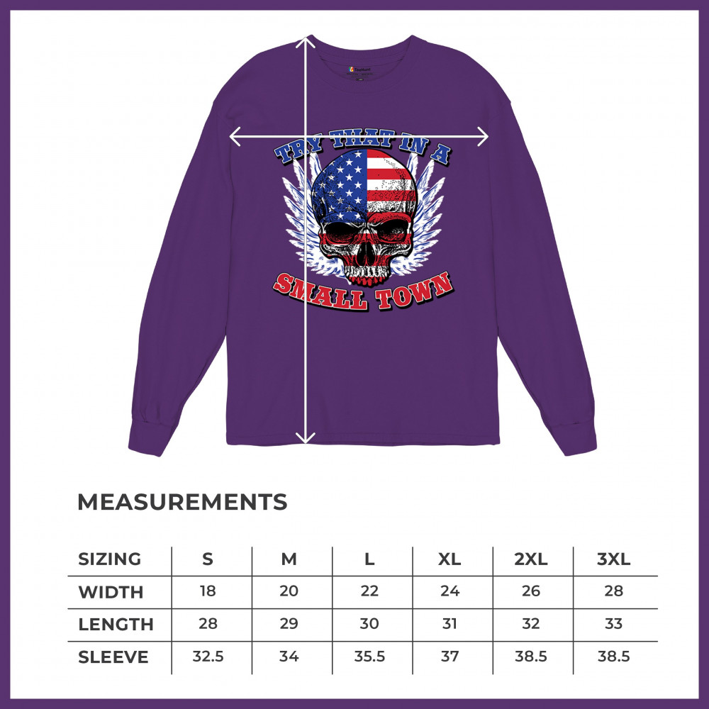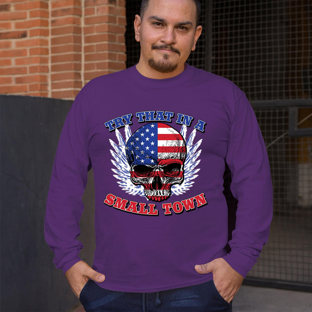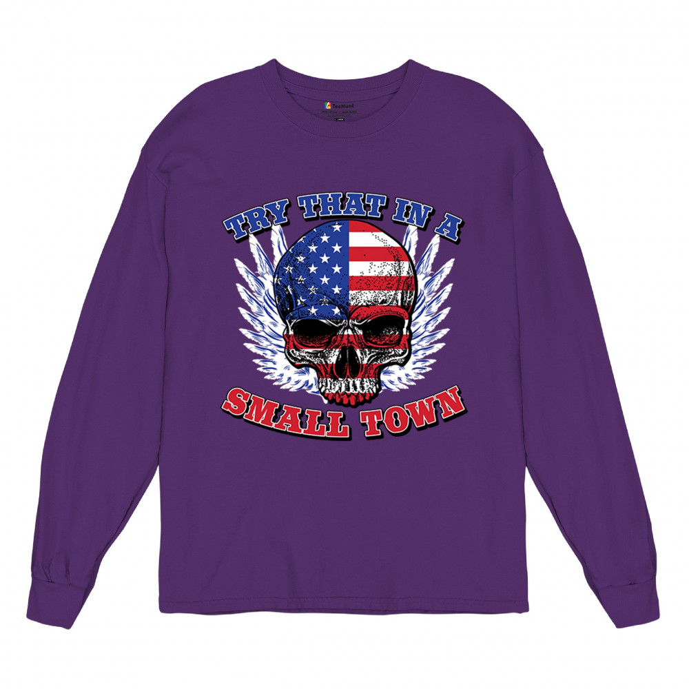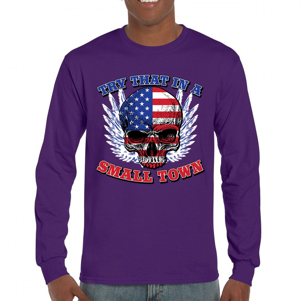 TRY THAT IN A SMALL TOWN long sleeve t-shirt american flag skull country music purple