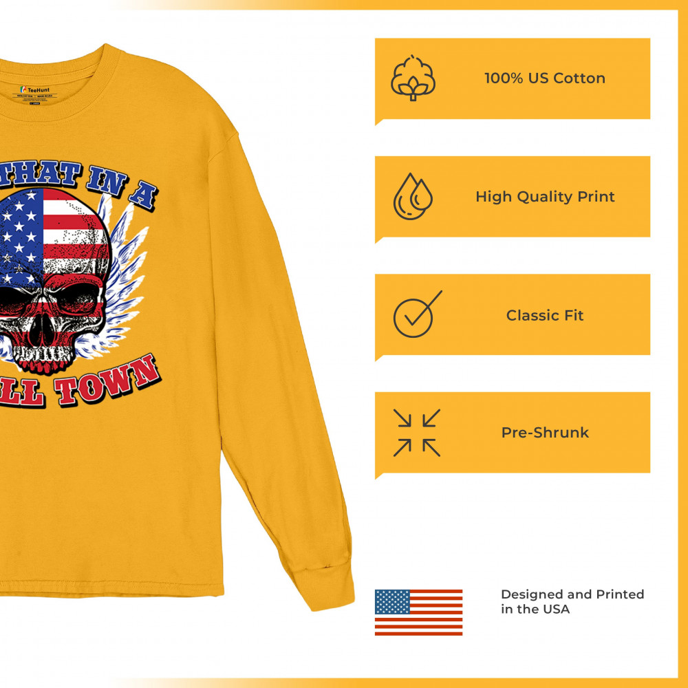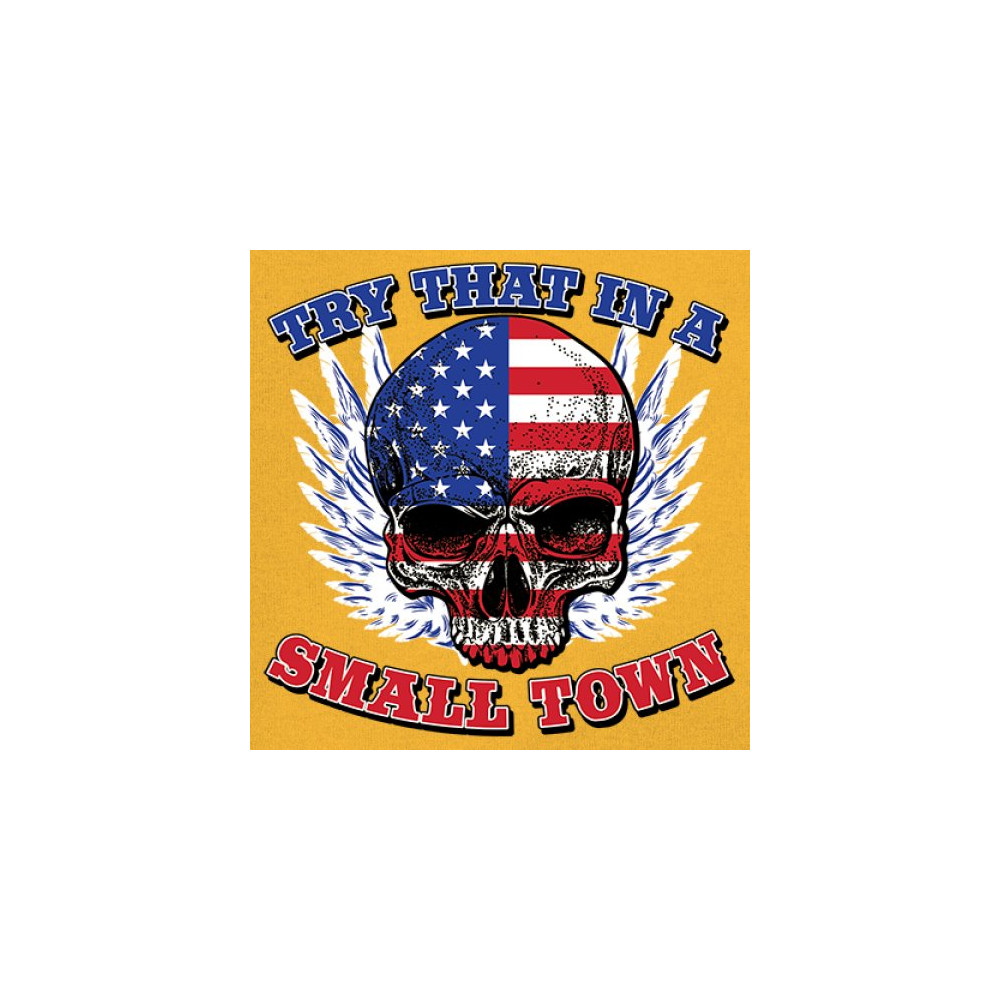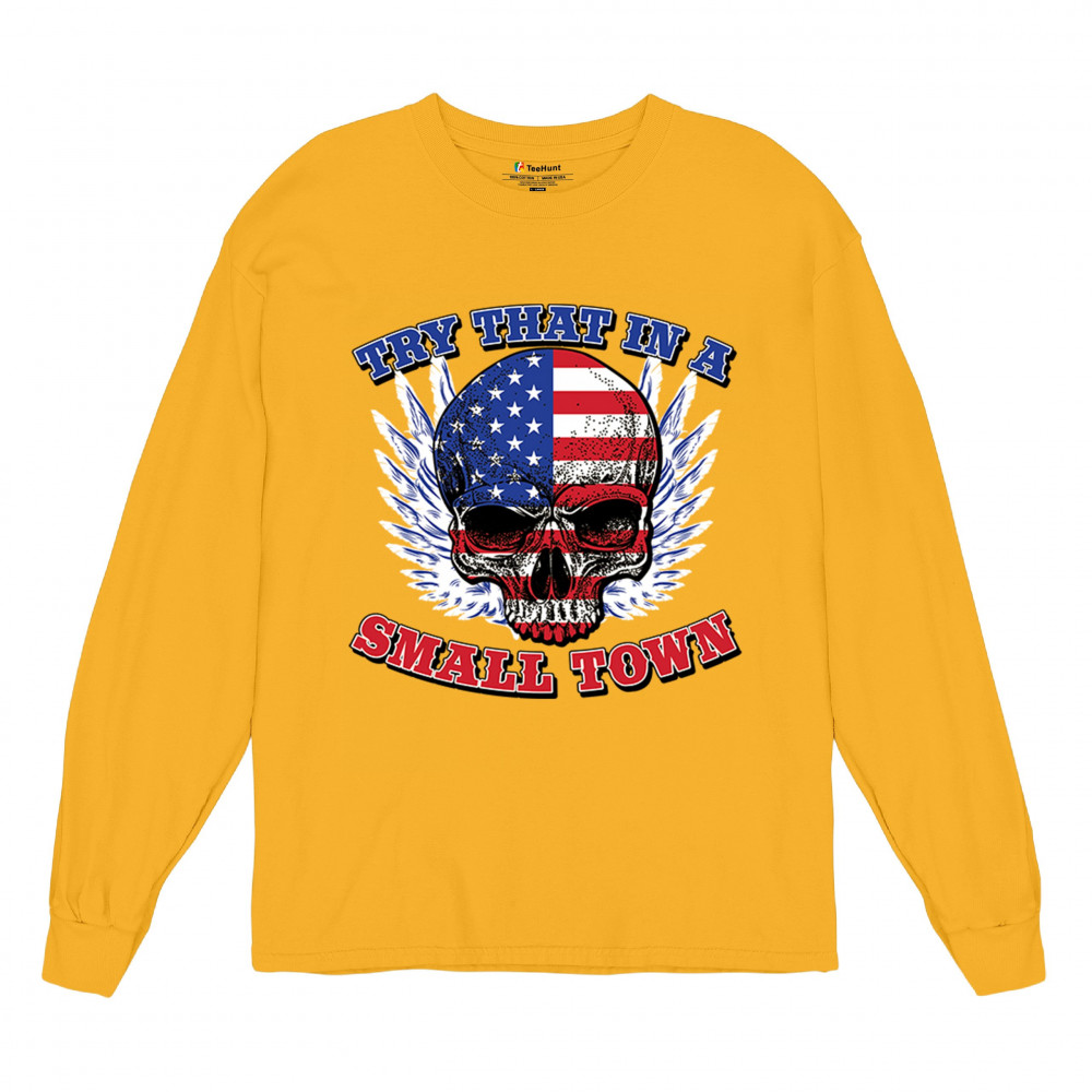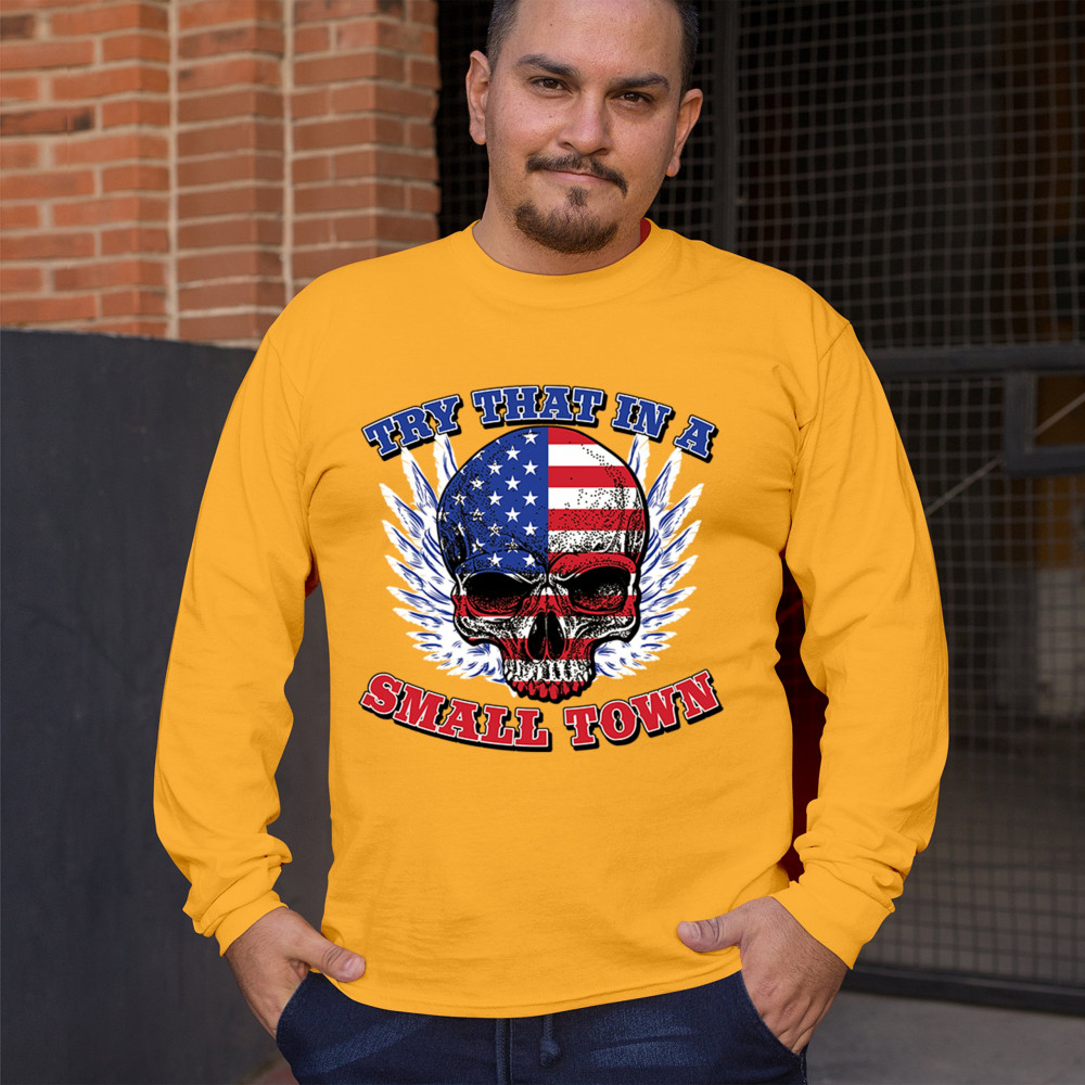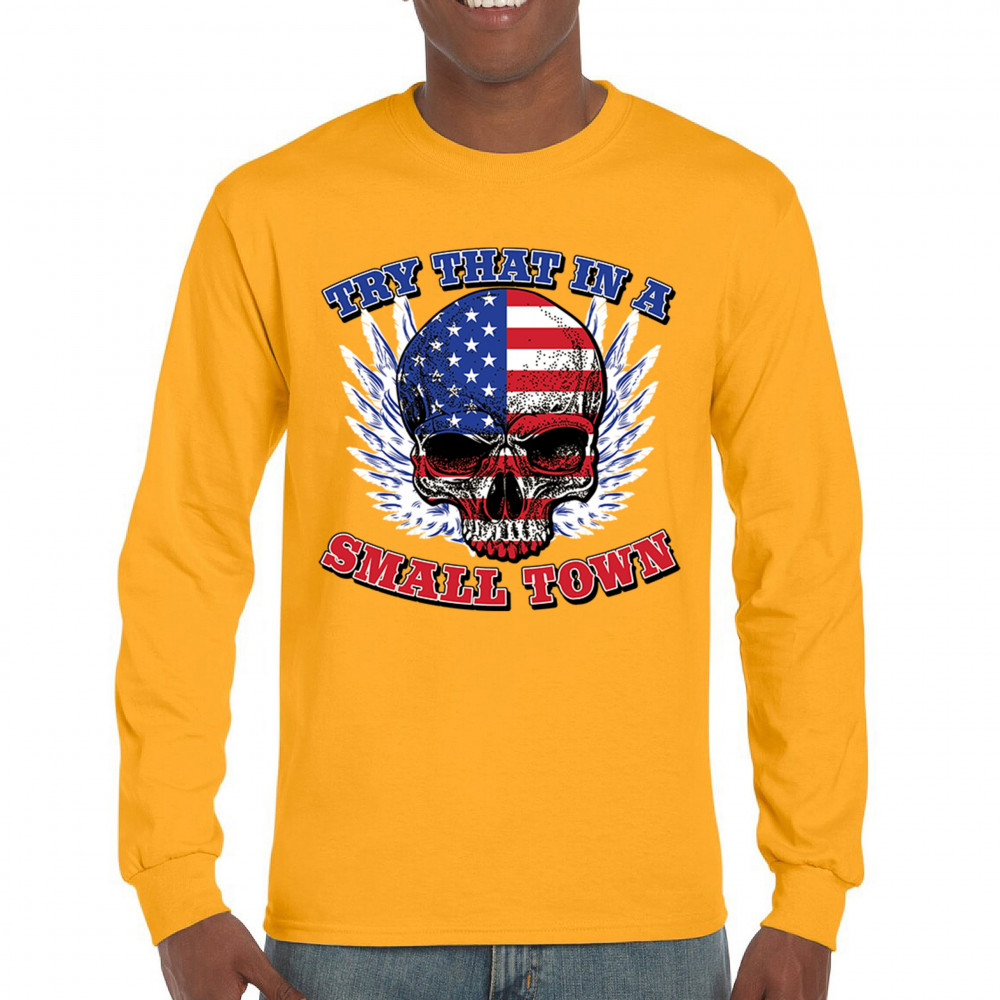 TRY THAT IN A SMALL TOWN long sleeve t-shirt american flag skull country music yellow
