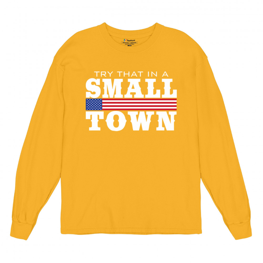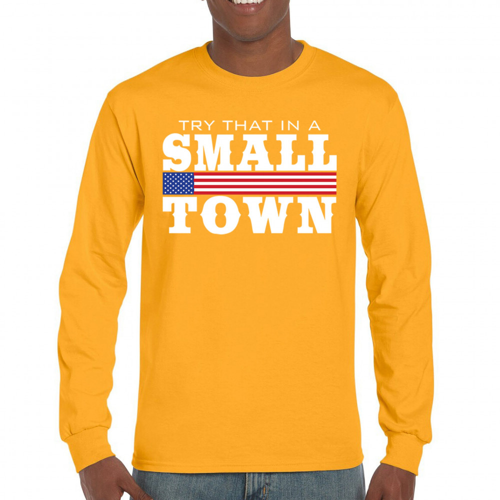 Celebrate small-town pride with our "Try That In A Small Town" design. Perfect for patriotic events, it features a bold American flag graphic.