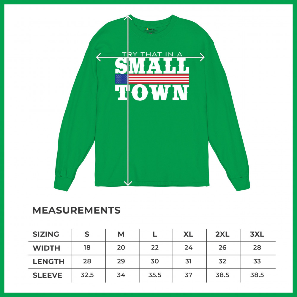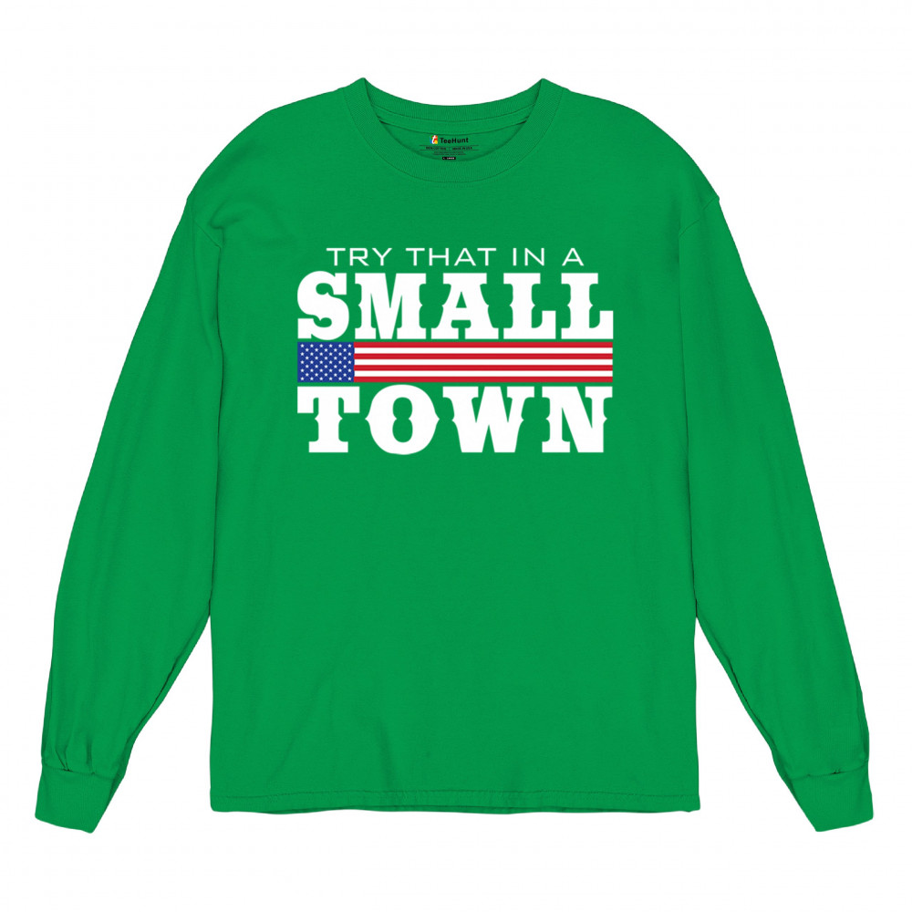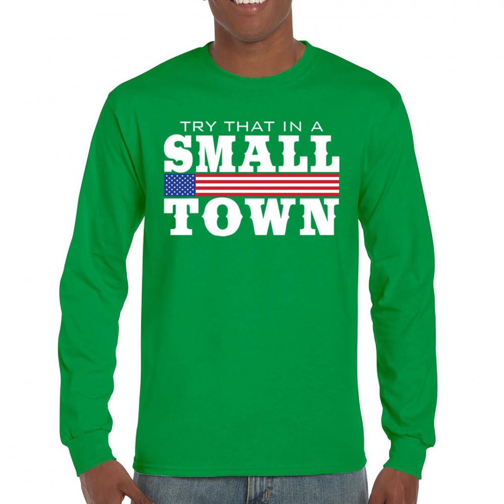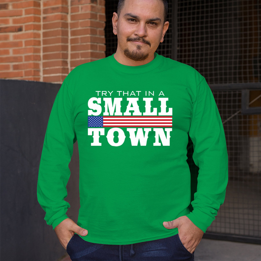 Celebrate small-town pride with our "Try That In A Small Town" design. Perfect for patriotic events, it features a bold American flag graphic.