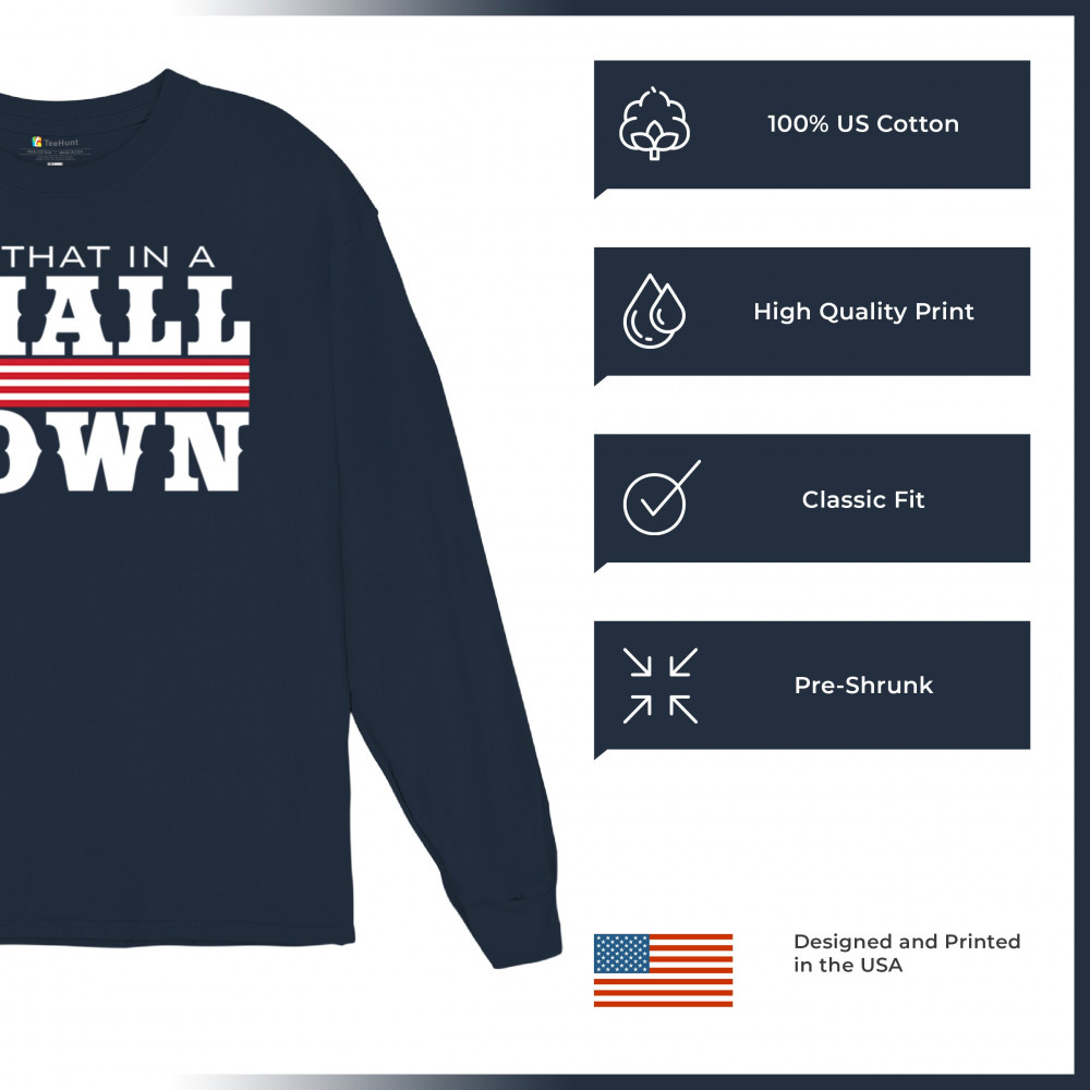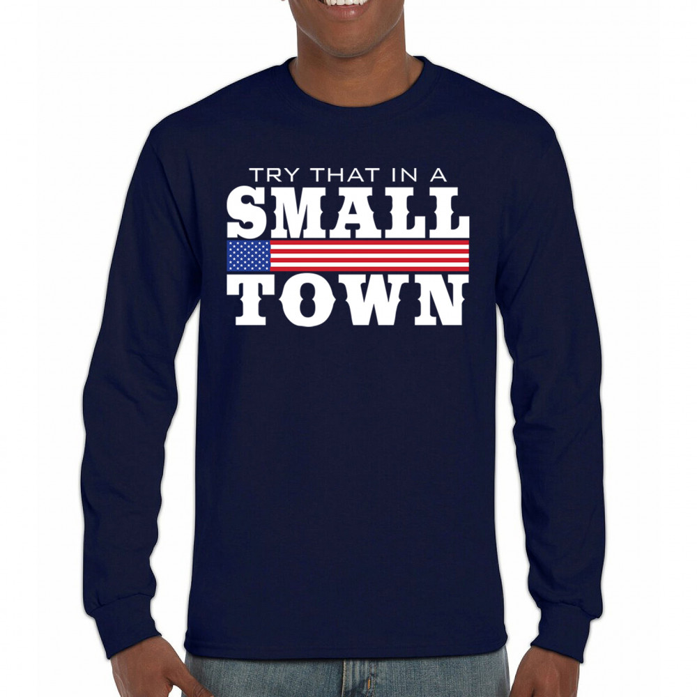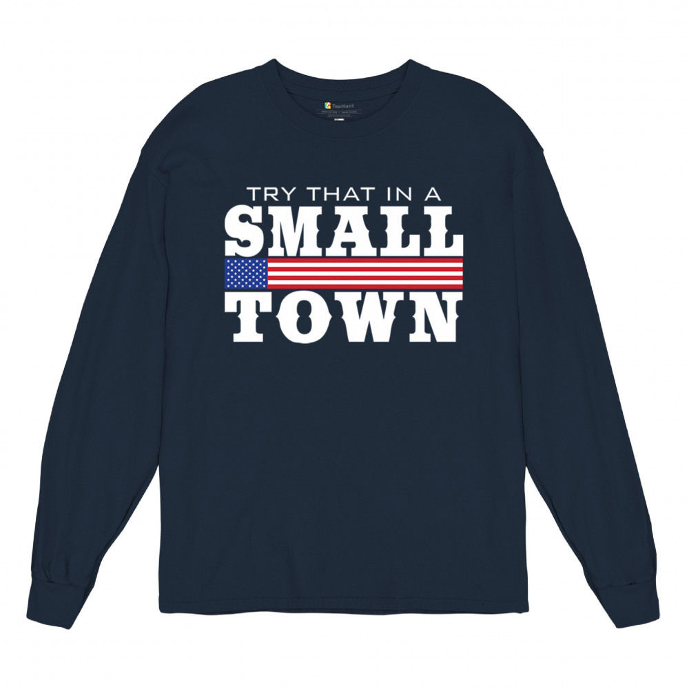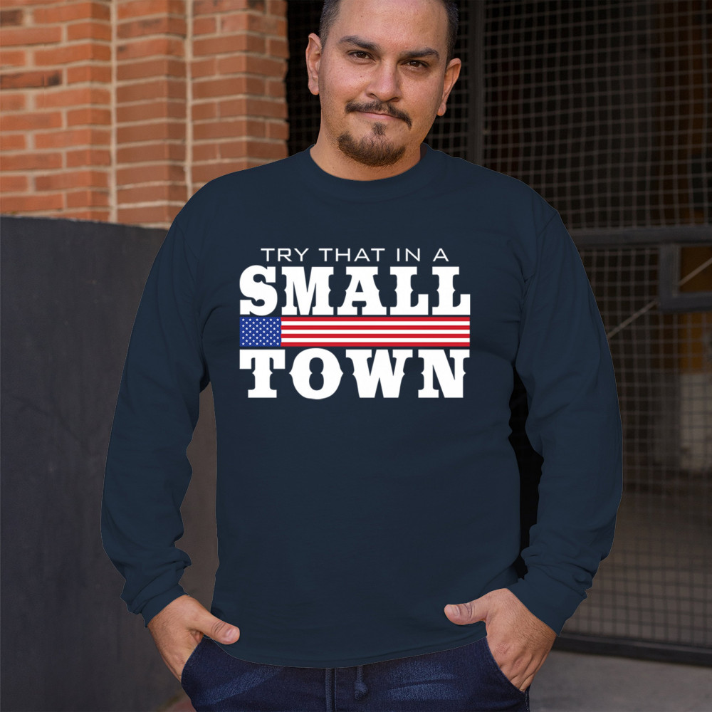 Celebrate small-town pride with our "Try That In A Small Town" design. Perfect for patriotic events, it features a bold American flag graphic.
