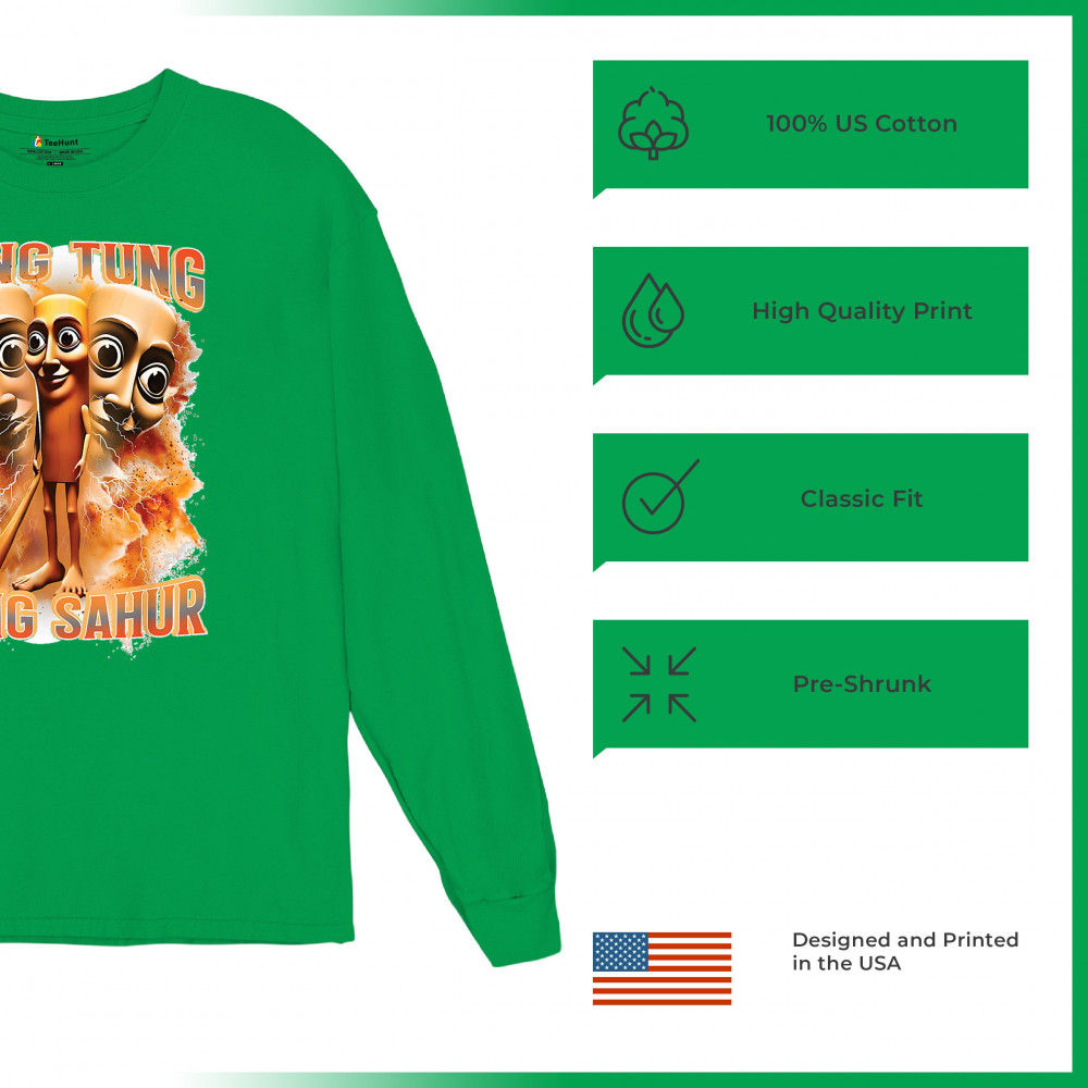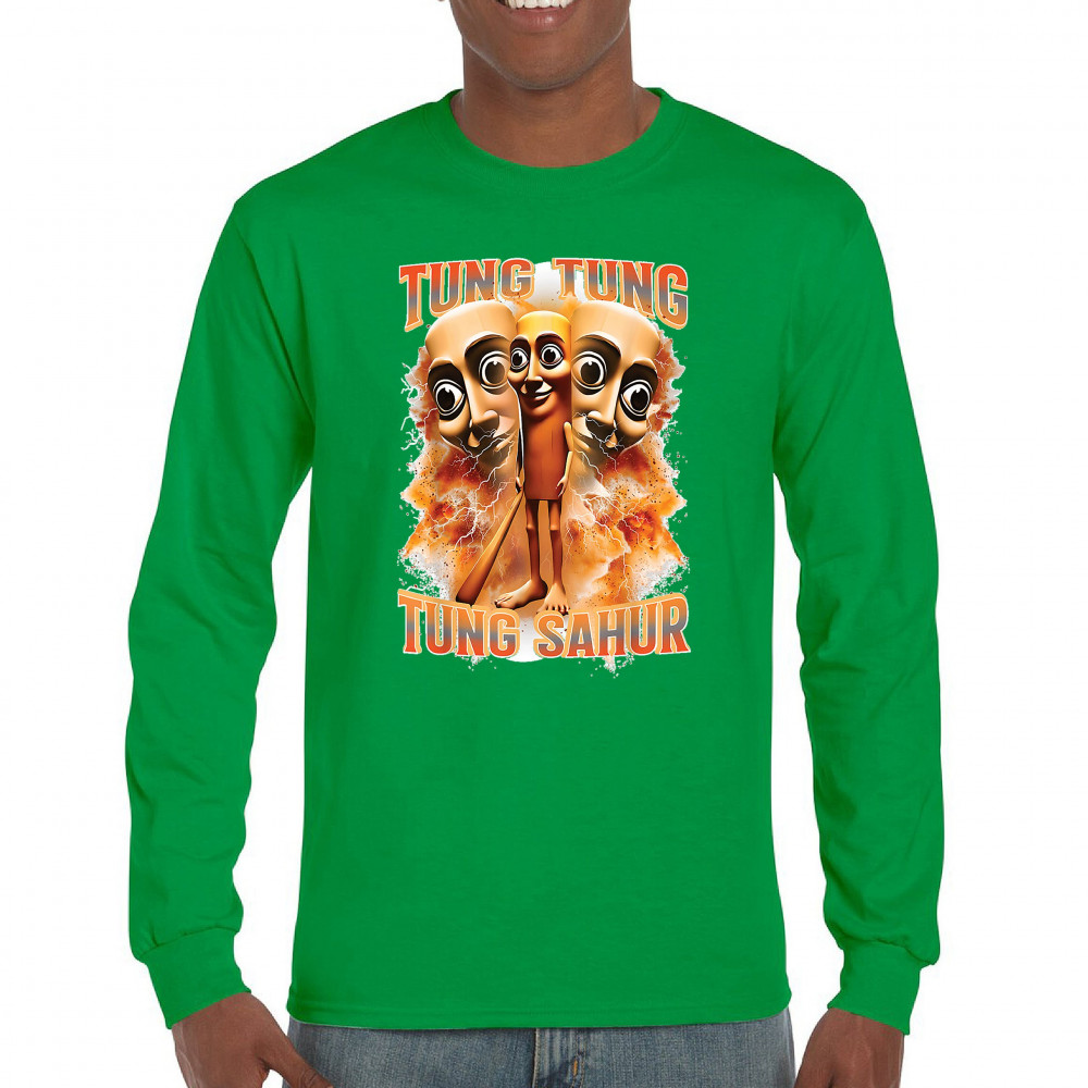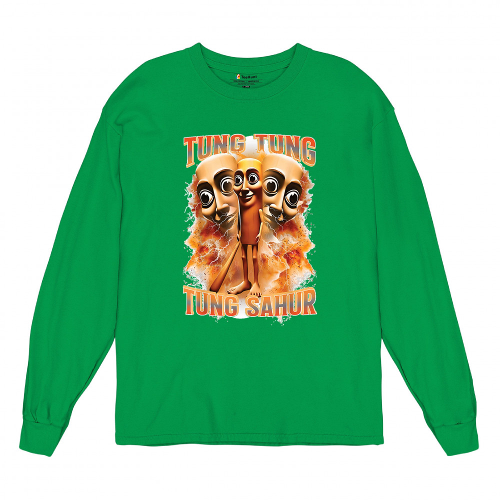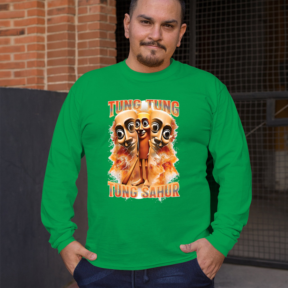 Brace yourself for pure meme insanity with the Tung Tung Tung Sahur shirt—a cursed-core fever dream built from TikTok chaos and Gen Z humor. This design blends internet meme culture, ironic fashion, brainrot visuals, and Gen Alpha absurdity. Perfect for those who wear memes, laugh at chaos, and live for viral trends.