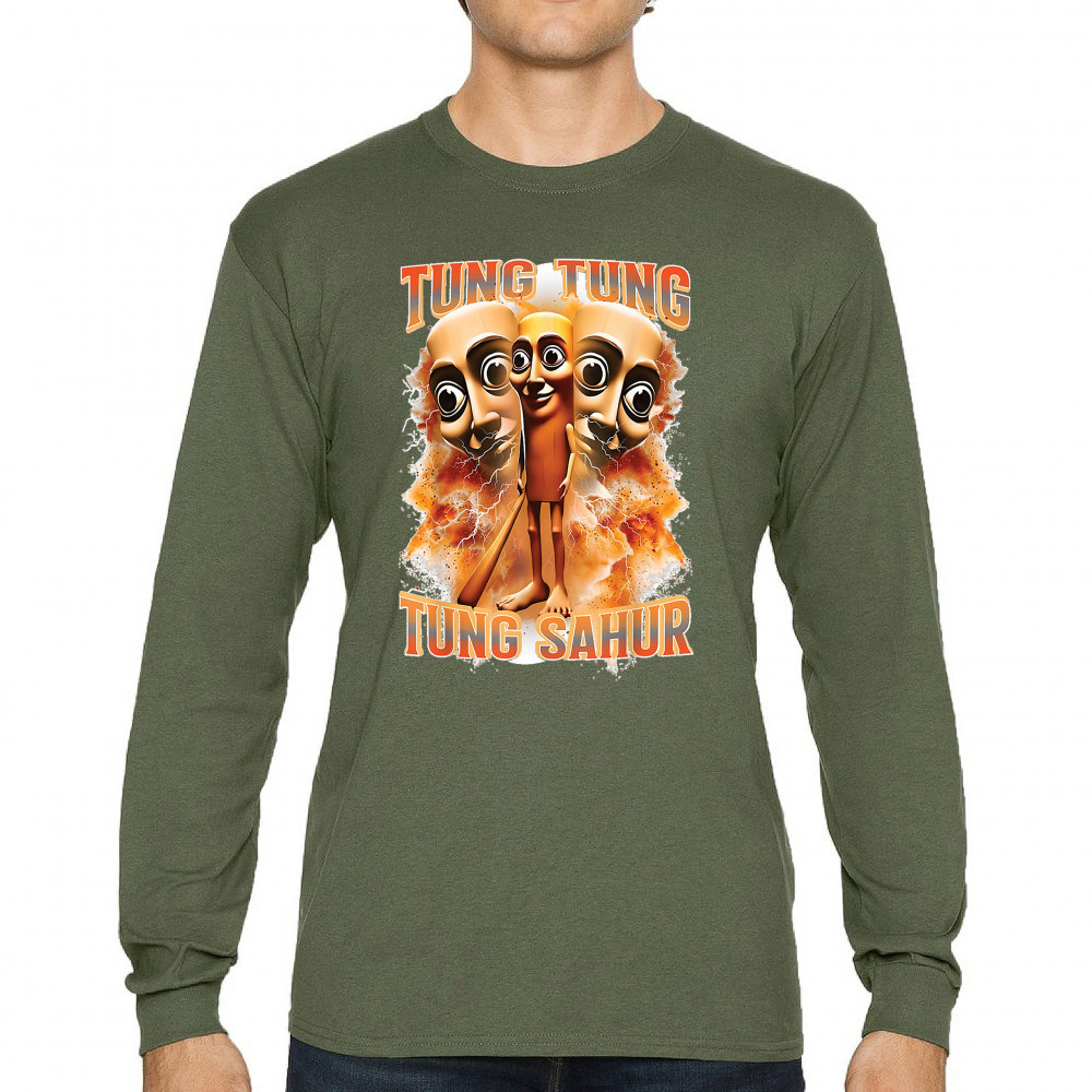 Brace yourself for pure meme insanity with the Tung Tung Tung Sahur shirt—a cursed-core fever dream built from TikTok chaos and Gen Z humor. This design blends internet meme culture, ironic fashion, brainrot visuals, and Gen Alpha absurdity. Perfect for those who wear memes, laugh at chaos, and live for viral trends.