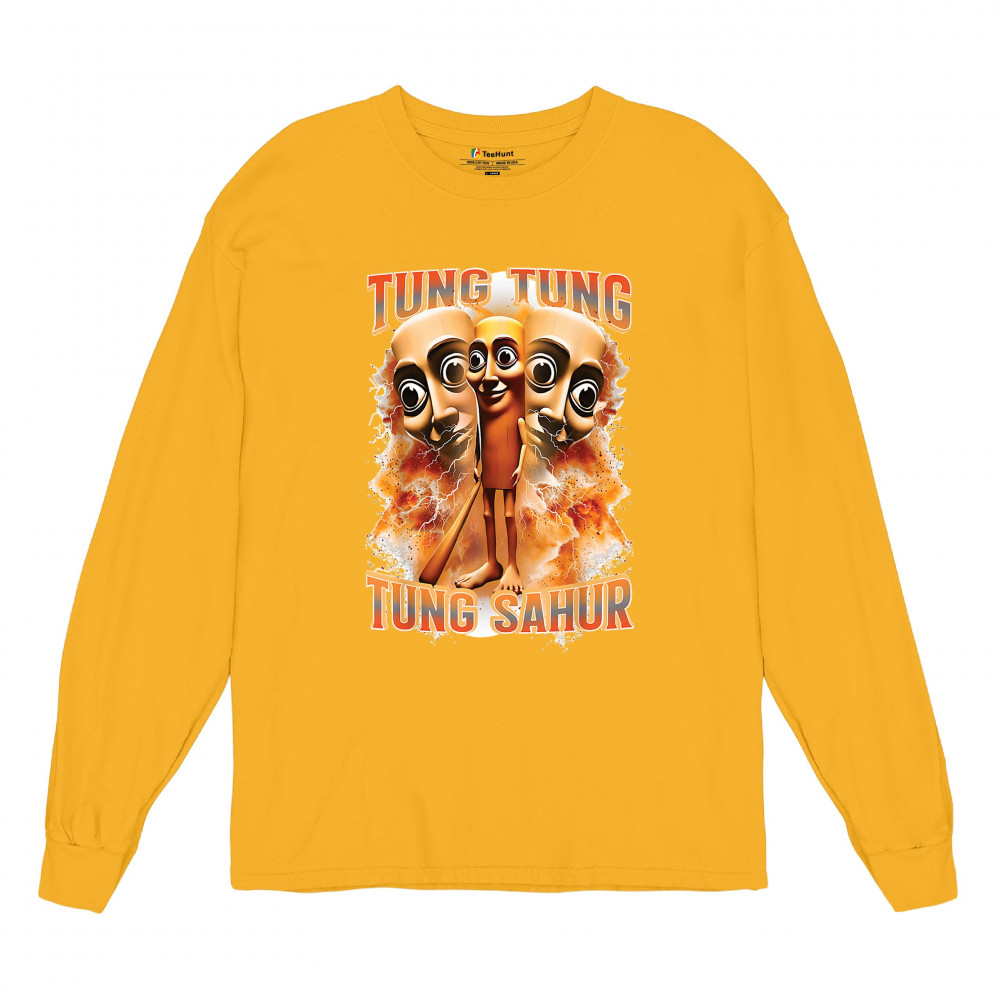Brace yourself for pure meme insanity with the Tung Tung Tung Sahur shirt—a cursed-core fever dream built from TikTok chaos and Gen Z humor. This design blends internet meme culture, ironic fashion, brainrot visuals, and Gen Alpha absurdity. Perfect for those who wear memes, laugh at chaos, and live for viral trends.