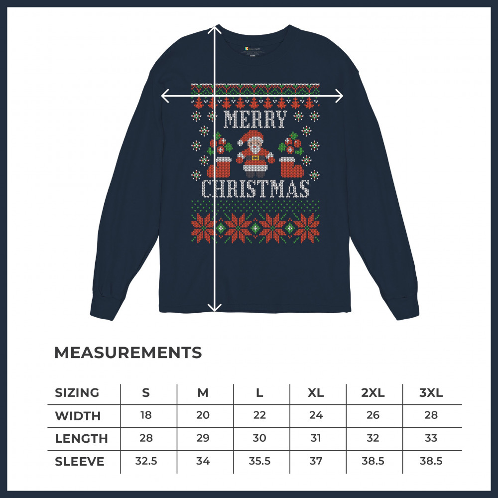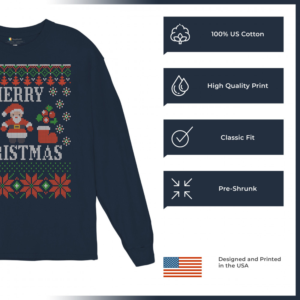 A print saying: "Merry Christmas" and depicting Santa Claus, two Christmas socks, multiple snowflakes and Christmas trees. The print is decorated as an ugly sweater. A great choice for a Christmas eve celebration.