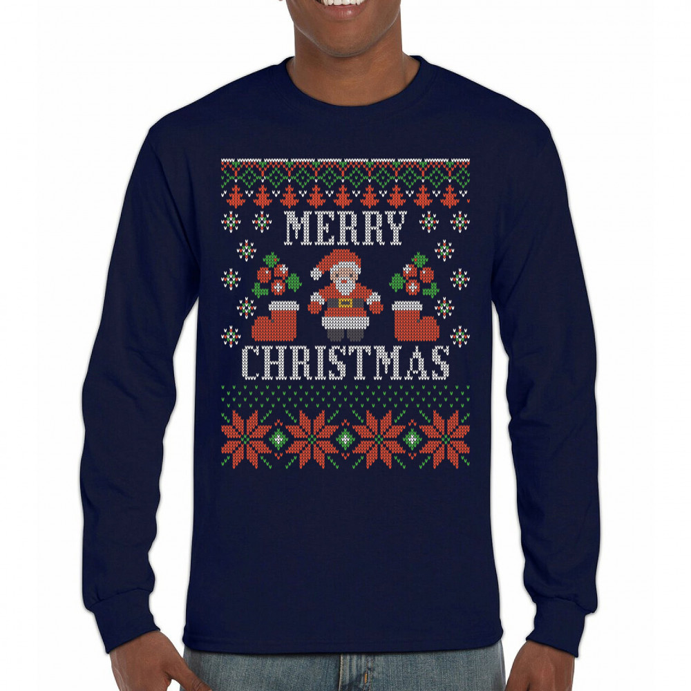 UGLY SWEATER SANTA CLAUS long sleeve t-shirt let it snow christmas jingle bells navy blue