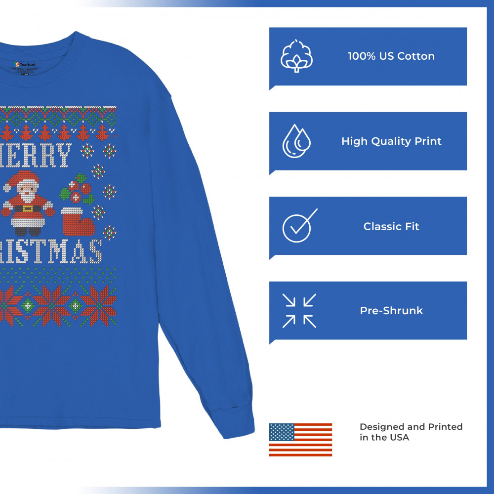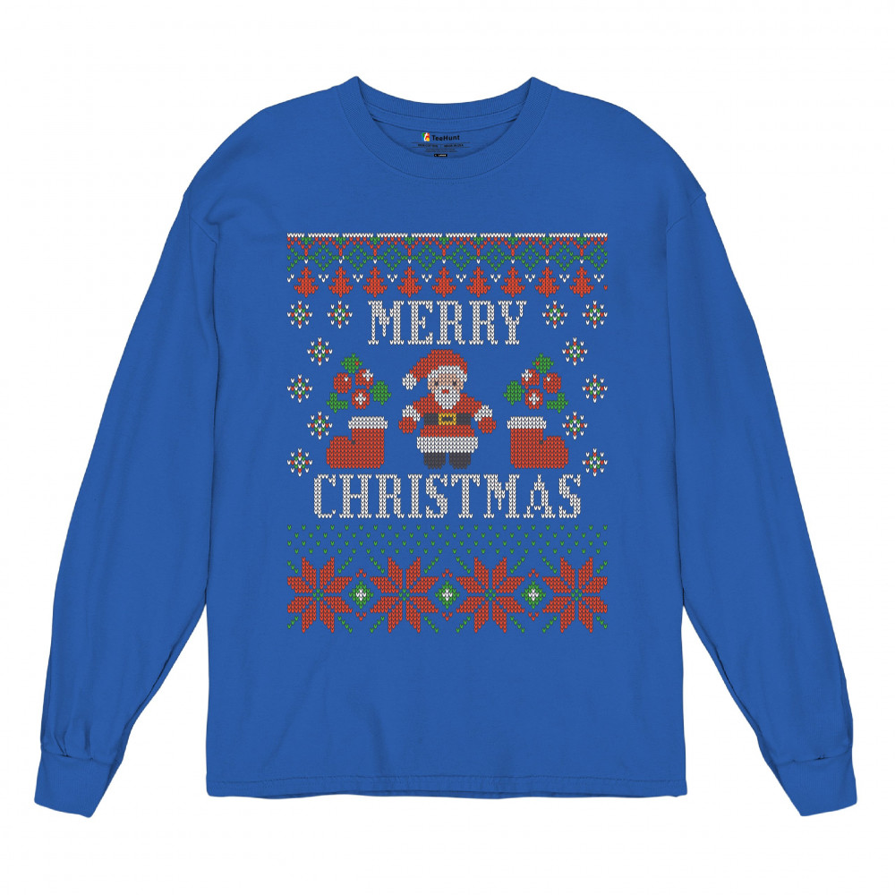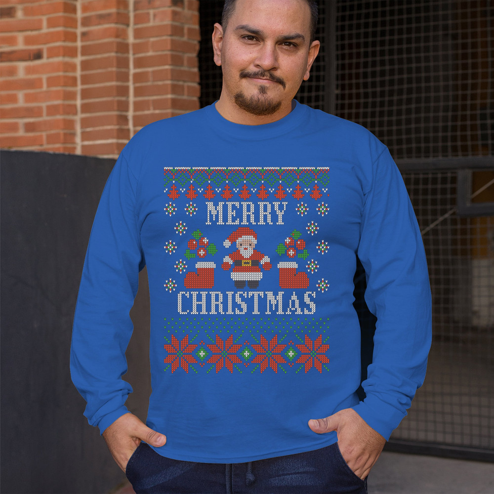 UGLY SWEATER SANTA CLAUS long sleeve t-shirt let it snow christmas jingle bells royal blue