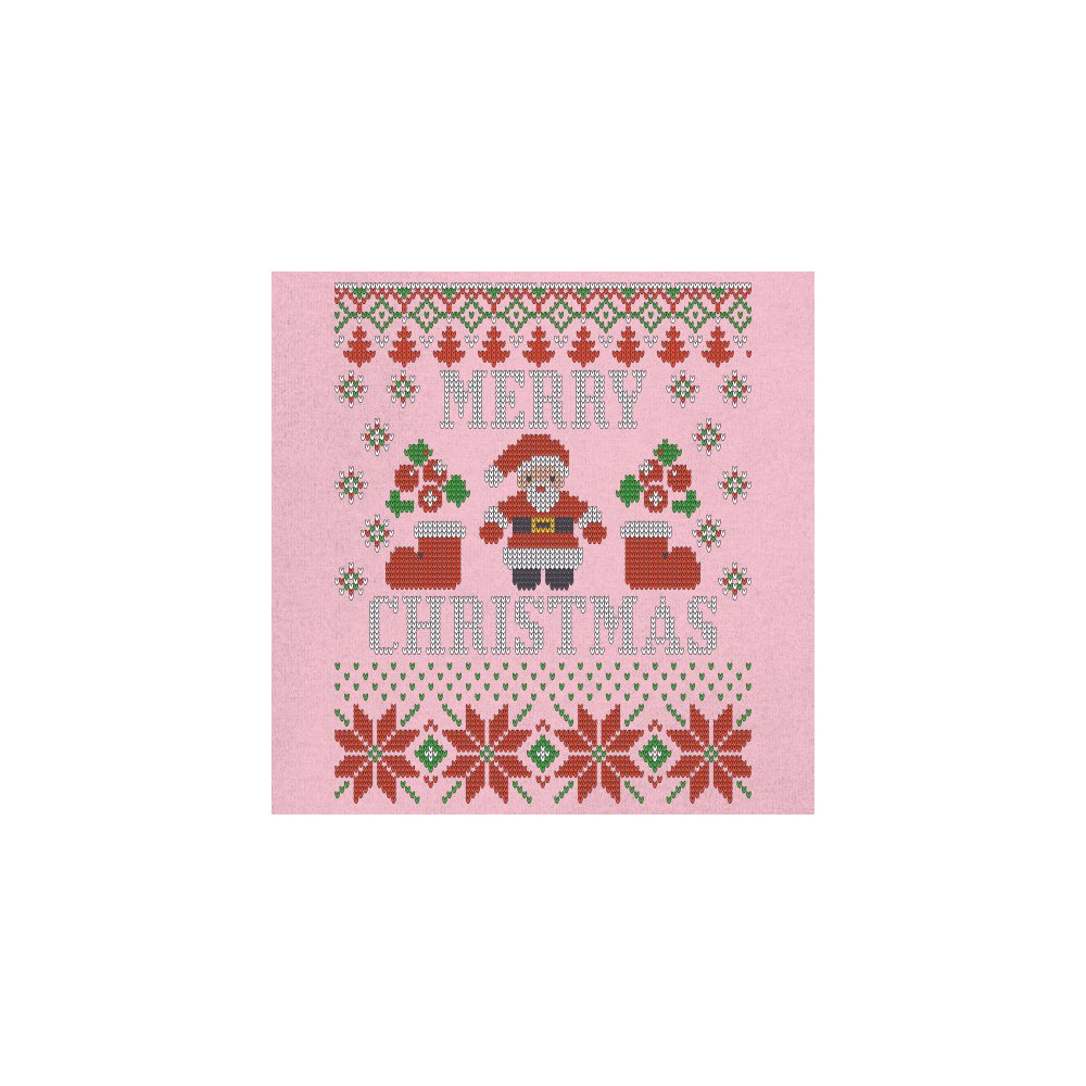 A print saying: "Merry Christmas" and depicting Santa Claus, two Christmas socks, multiple snowflakes and Christmas trees. The print is decorated as an ugly sweater. A great choice for a Christmas eve celebration.