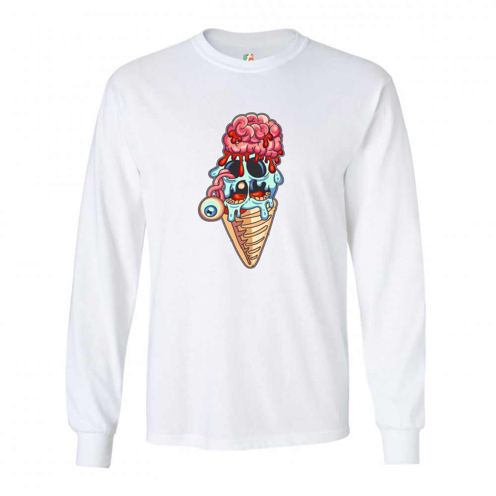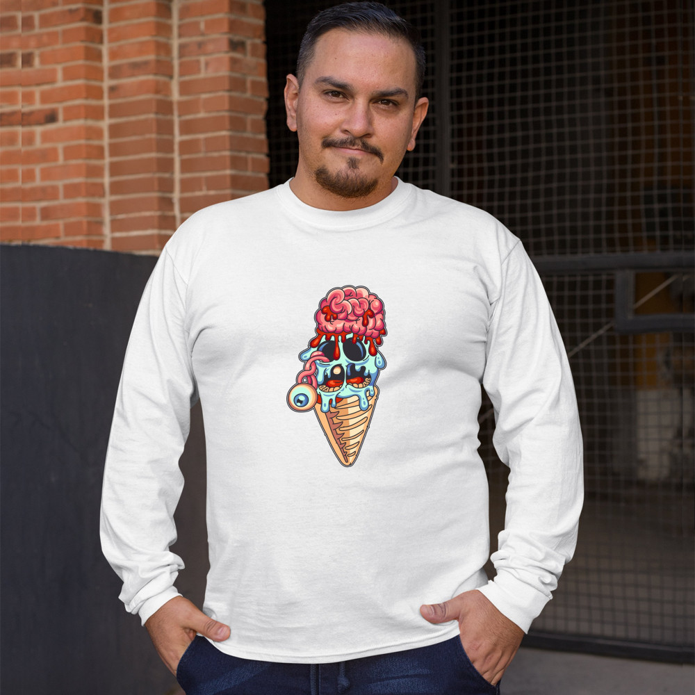 A print featuring an undead ice cream. The ice cream ball looks like a head of a zombie with an eye popping out and hanging and bloodied brains attached on top. A great choice for a person who is into horror movies, haunted houses and freaking people out!