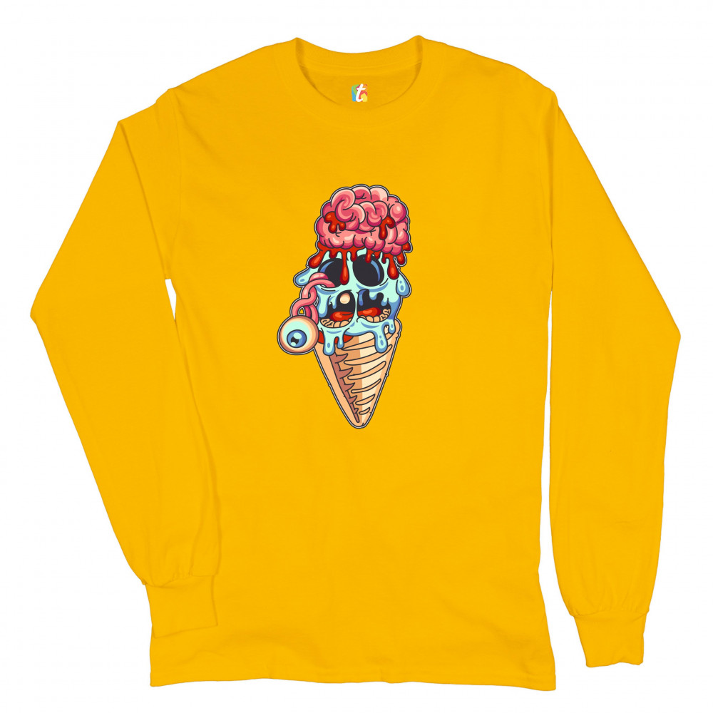 A print featuring an undead ice cream. The ice cream ball looks like a head of a zombie with an eye popping out and hanging and bloodied brains attached on top. A great choice for a person who is into horror movies, haunted houses and freaking people out!