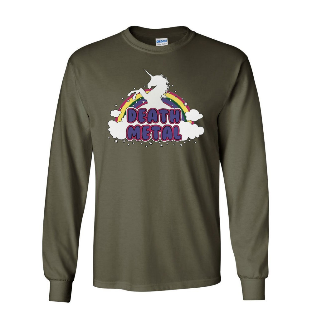 UNICORN DEATH METAL long sleeve t-shirt rainbow hilarious cute heavy music tee military green