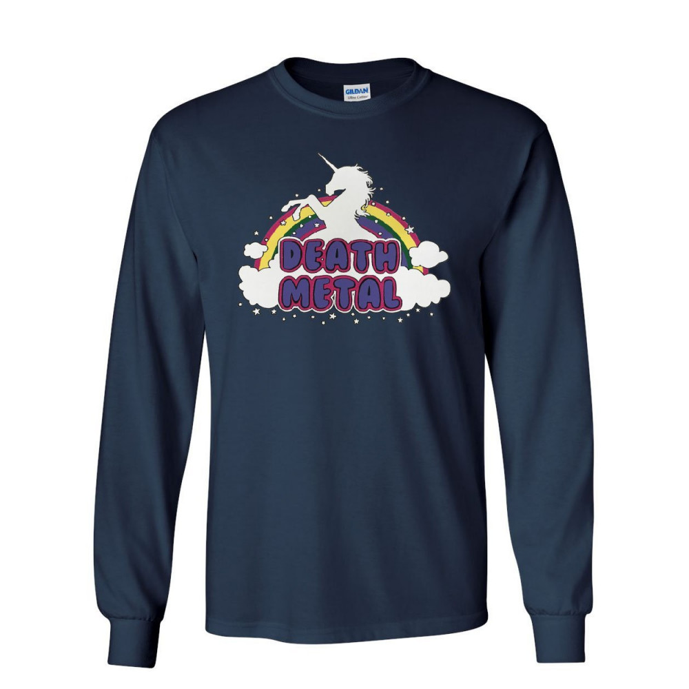 UNICORN DEATH METAL long sleeve t-shirt rainbow hilarious cute heavy music tee navy blue