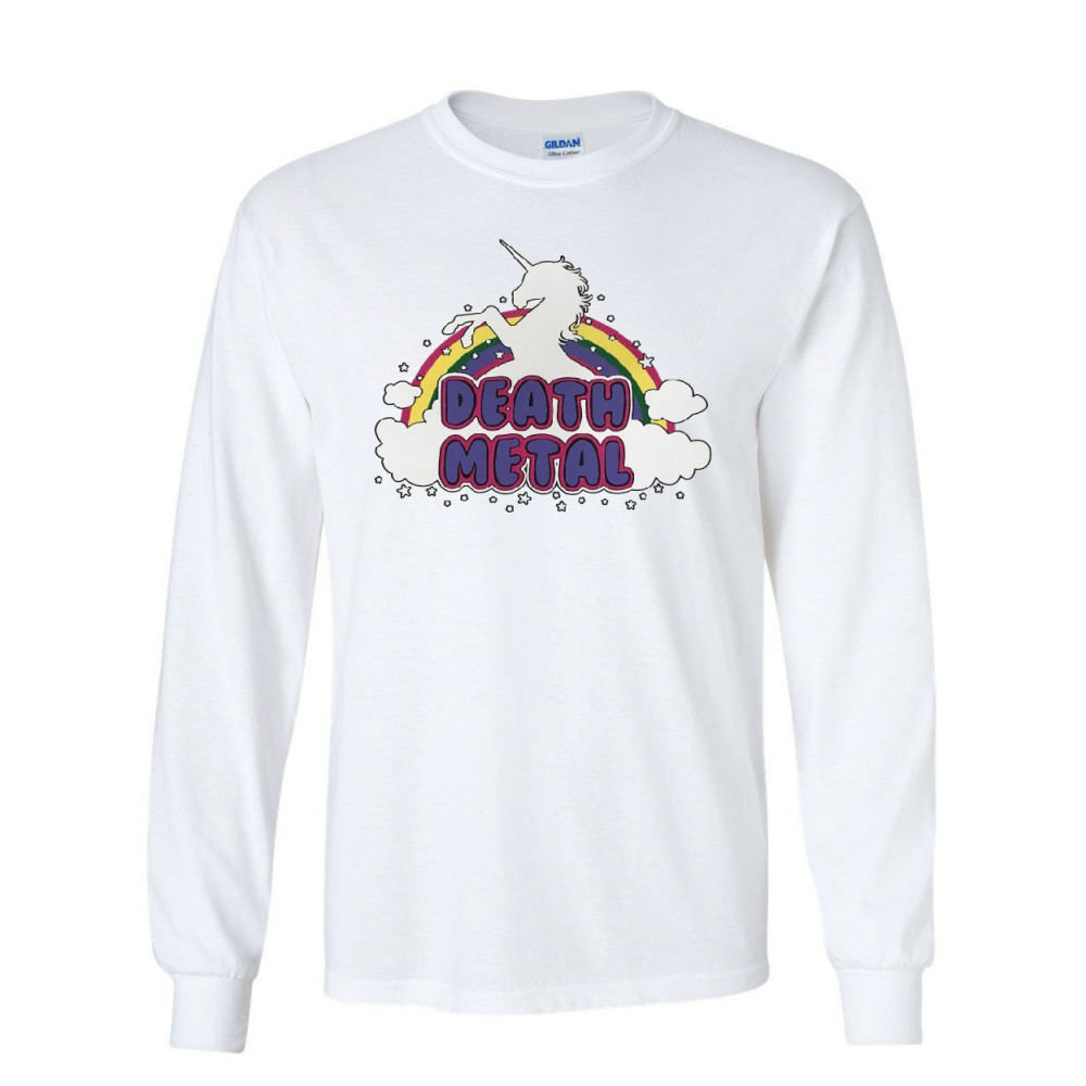 UNICORN DEATH METAL long sleeve t-shirt rainbow hilarious cute heavy music tee white