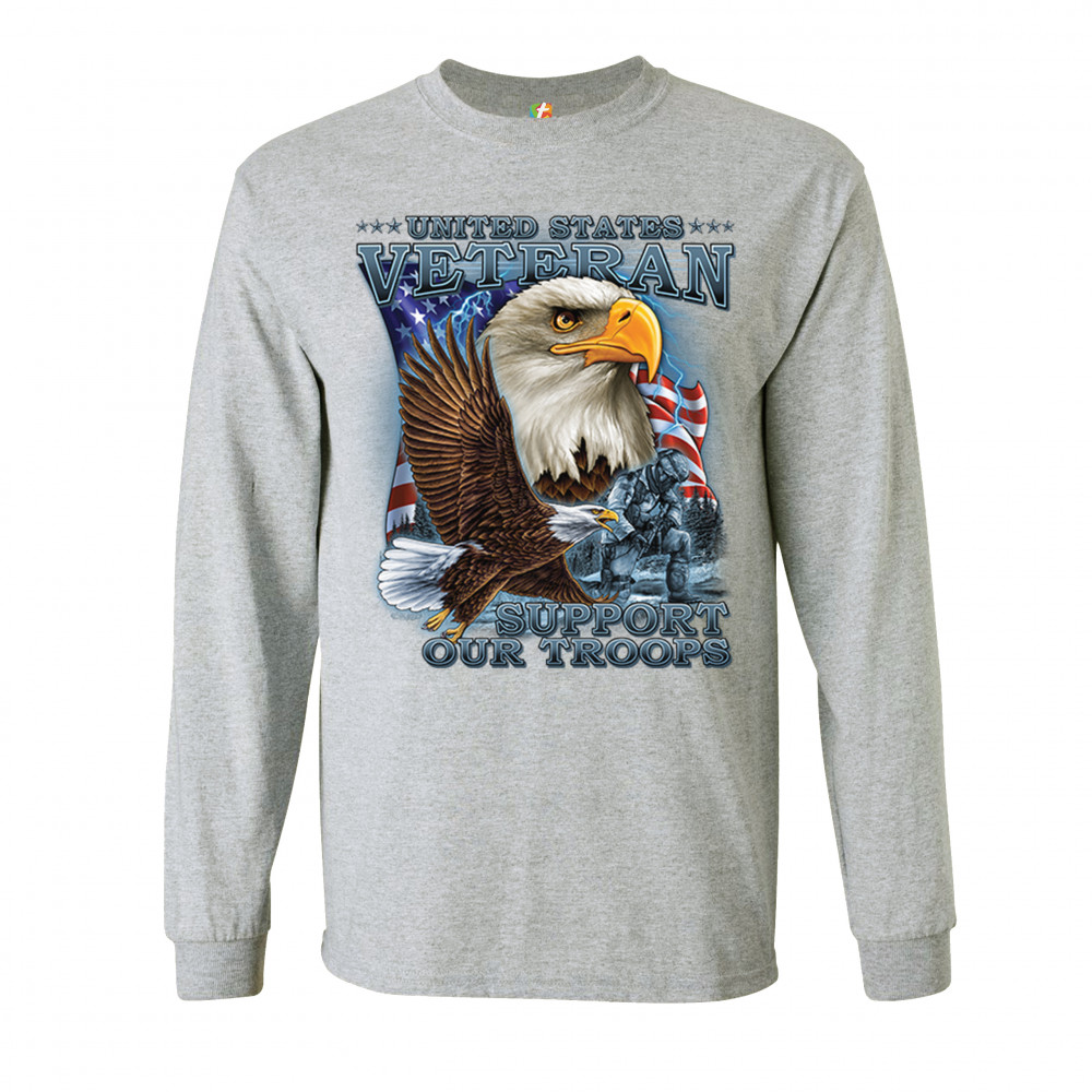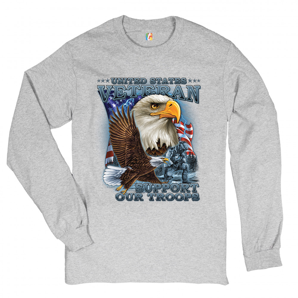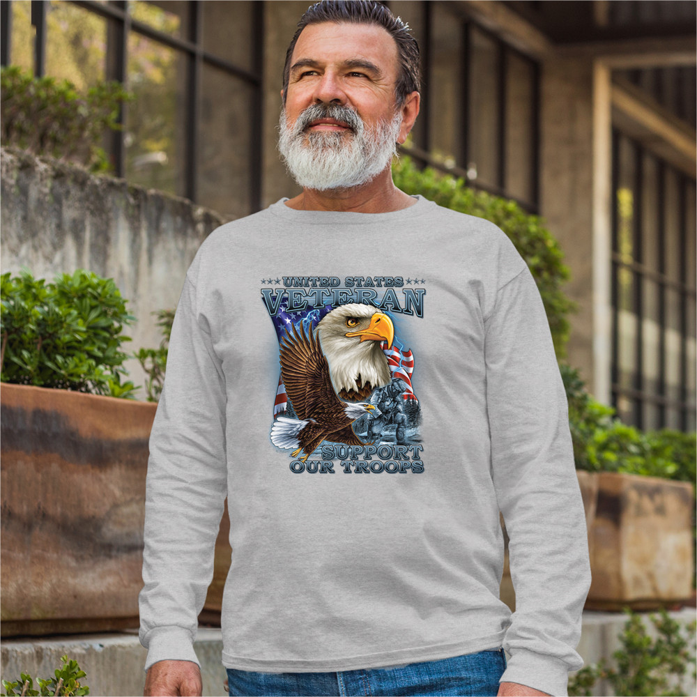 A patriotic print featuring a flying American bald eagle. There is another bald eagle covering most of the American flag in the background. There is a kneeling soldier in the front. The print says: "United States Veteran, Support our Troops". A great choice for a true patriot of the USA