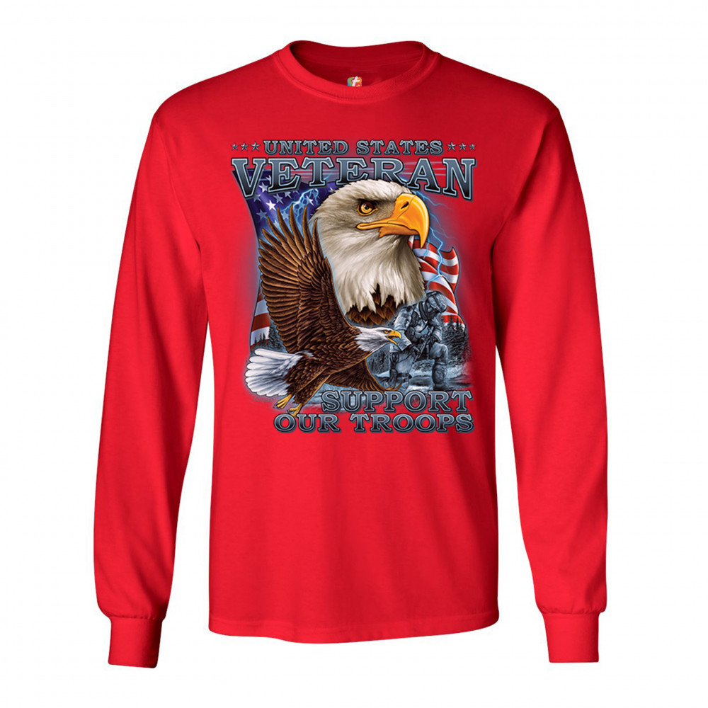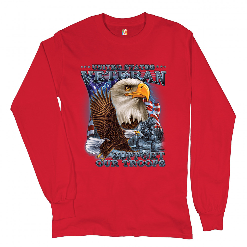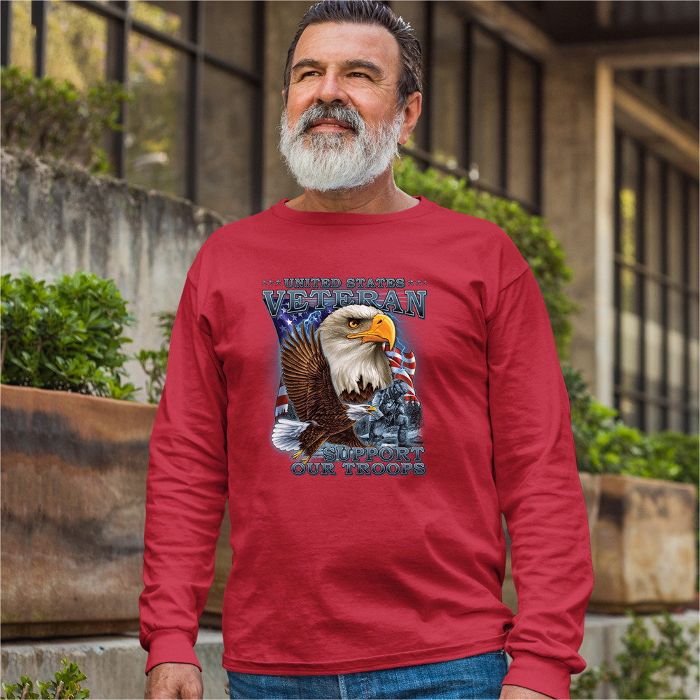 A patriotic print featuring a flying American bald eagle. There is another bald eagle covering most of the American flag in the background. There is a kneeling soldier in the front. The print says: "United States Veteran, Support our Troops". A great choice for a true patriot of the USA