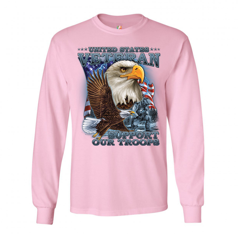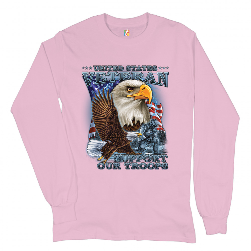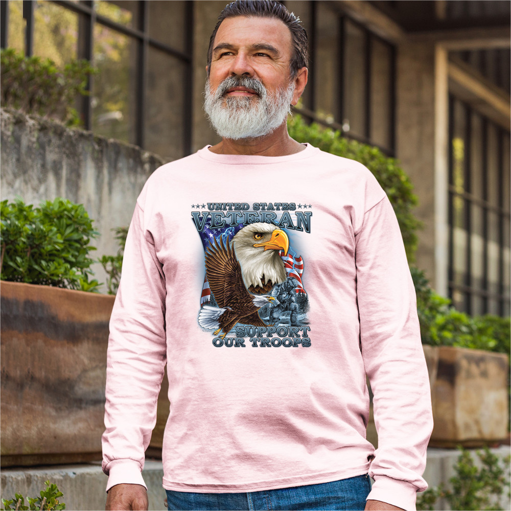 A patriotic print featuring a flying American bald eagle. There is another bald eagle covering most of the American flag in the background. There is a kneeling soldier in the front. The print says: "United States Veteran, Support our Troops". A great choice for a true patriot of the USA