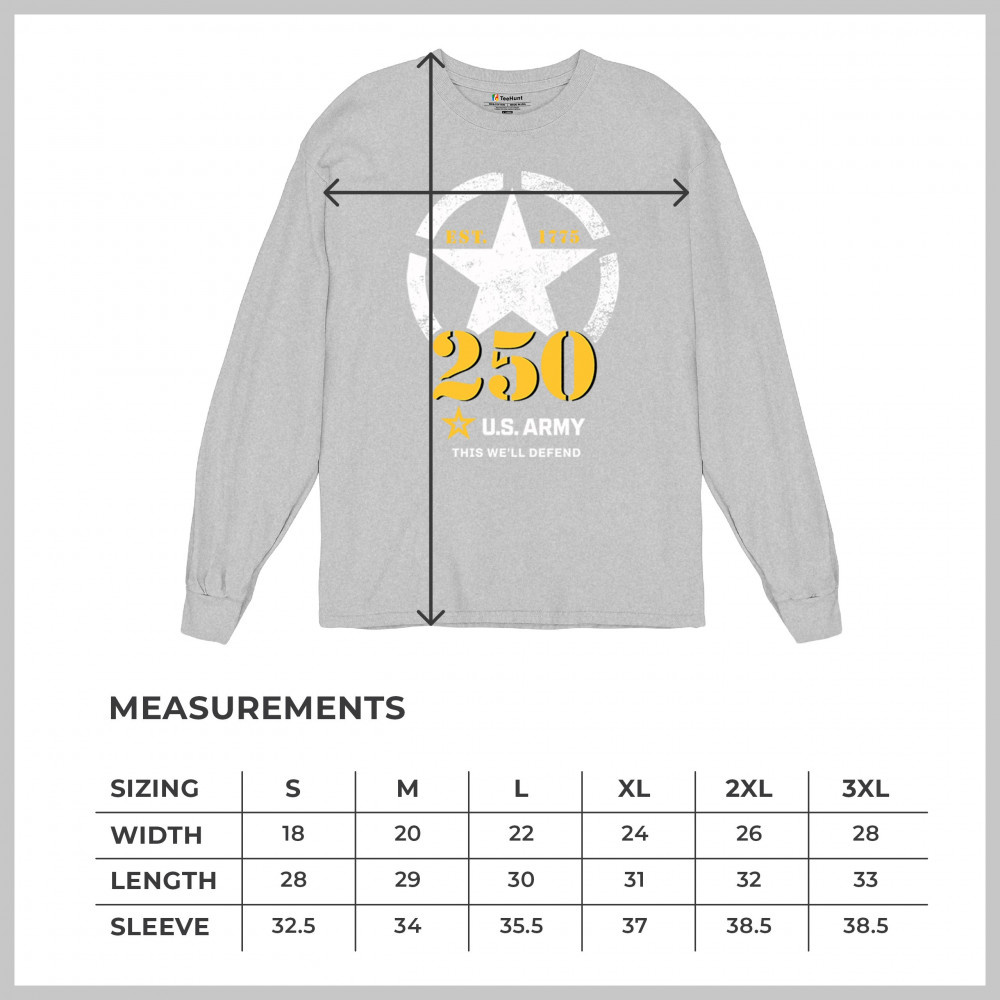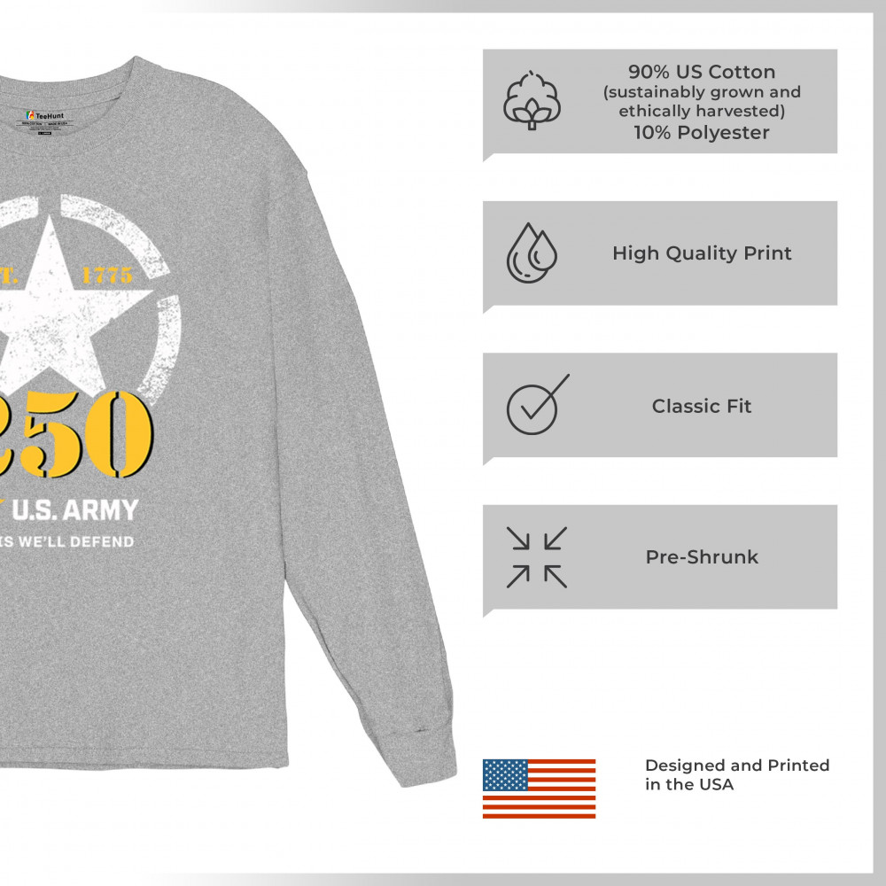 Celebrate 250 years of U.S. Army duty and pride with bold stencil design, EST 1775 mark, and patriotic “This We’ll Defend†motto.