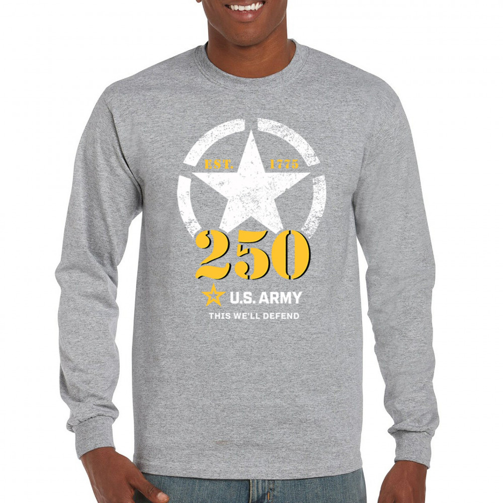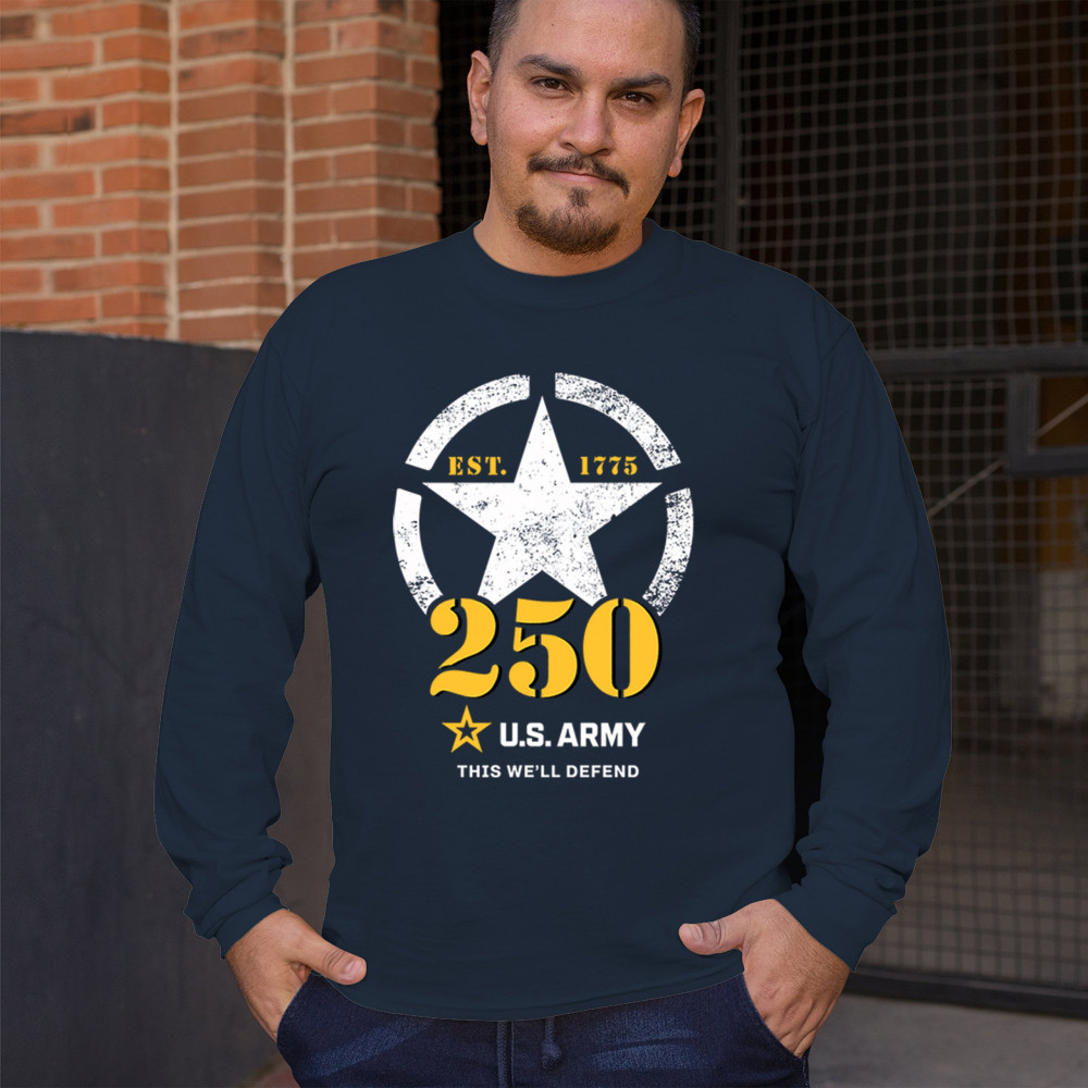 Boldly marking the U.S. Army’s 250th anniversary, this design includes a distressed white star, 1775 EST detail, and bold yellow “250†typeface beneath the iconic motto “This We’ll Defend.†A fitting tribute for veterans, service members, and families who want to show respect and pride during military observances or patriotic events.