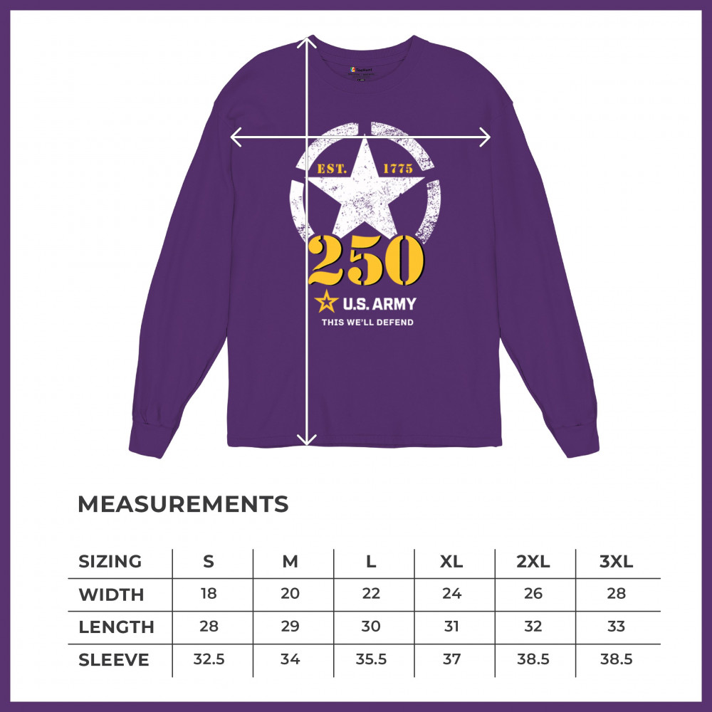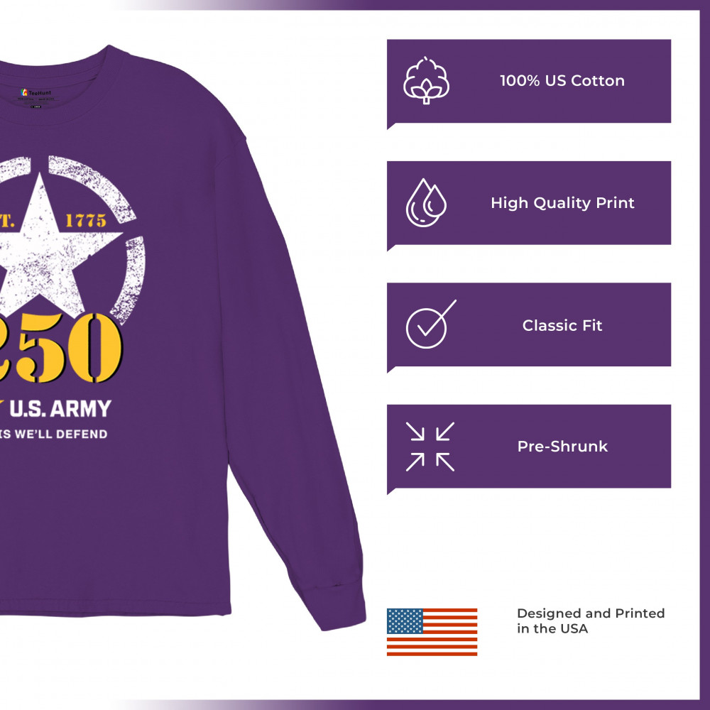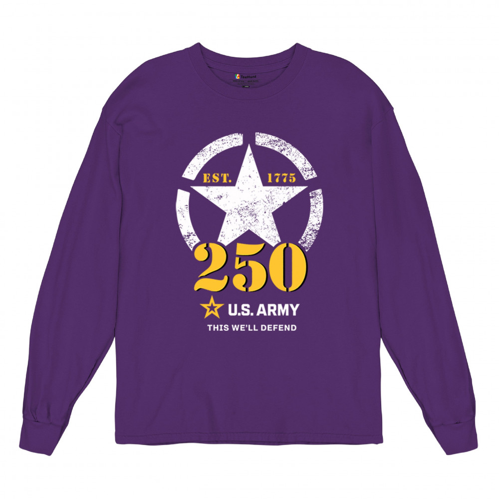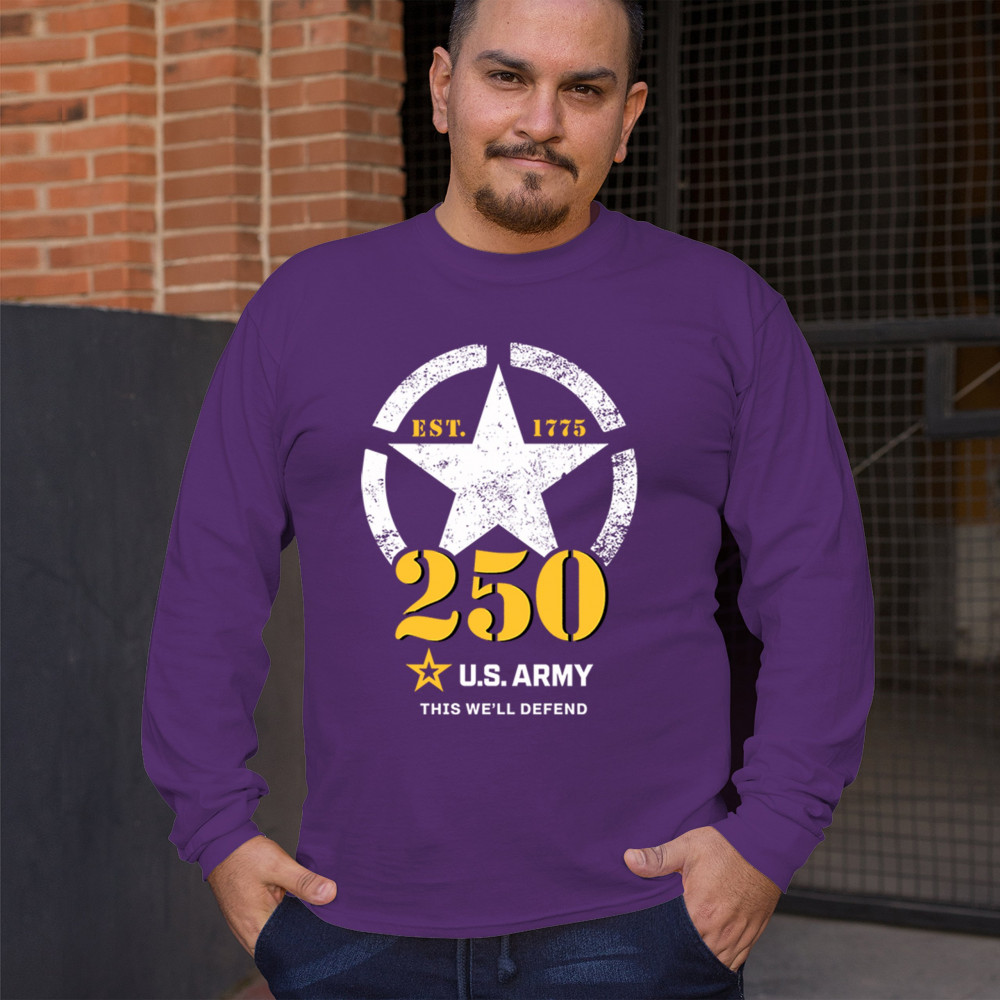 Celebrate 250 years of U.S. Army duty and pride with bold stencil design, EST 1775 mark, and patriotic “This We’ll Defend†motto.