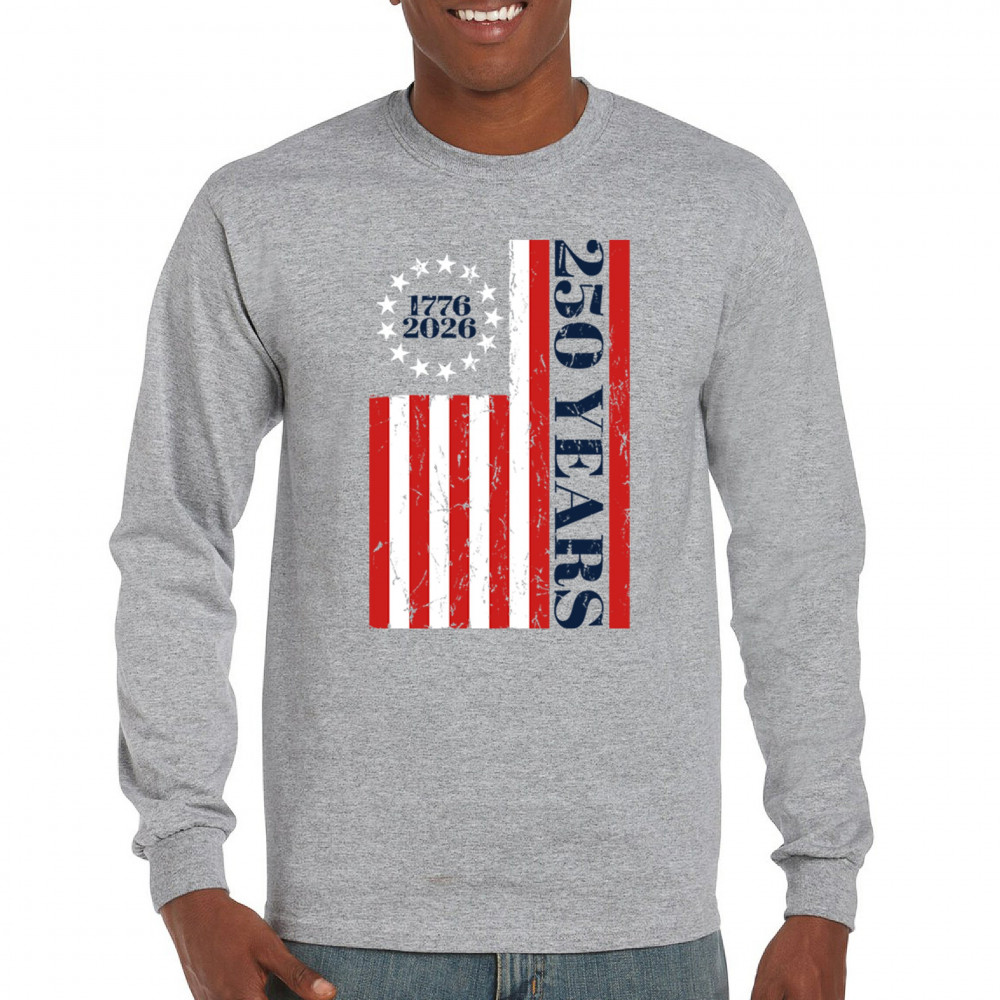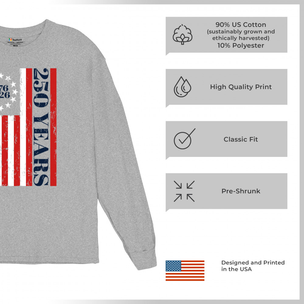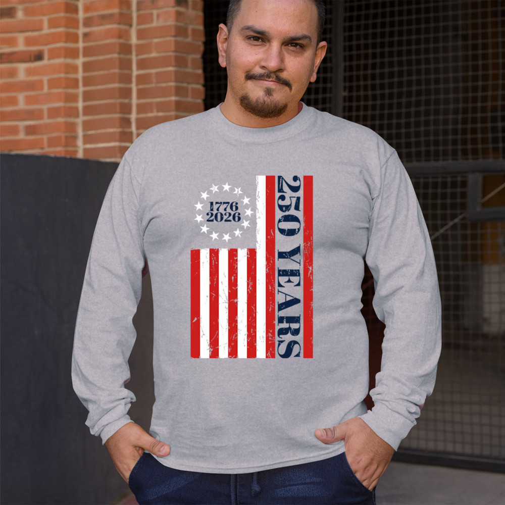Celebrate USA 250 with patriotic flag shirt, America heritage 250, 1776–2026 milestone, American pride, and Independence Day freedom.