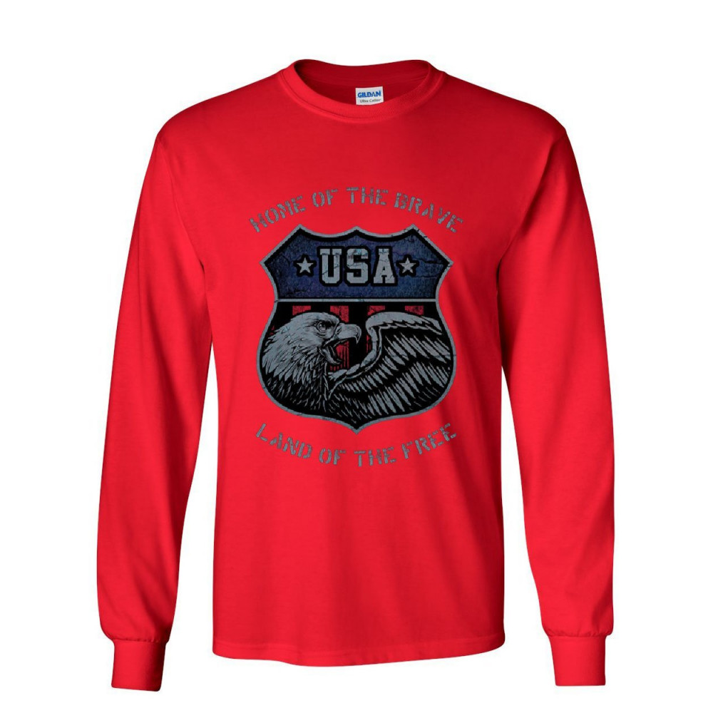 USA SHIELD PATRIOTIC long sleeve t-shirt home of the brave land of the free tee red