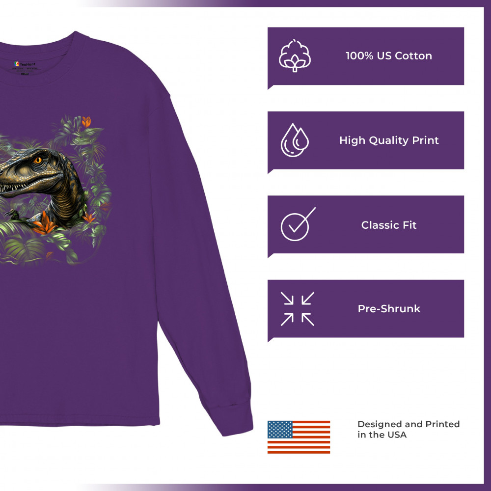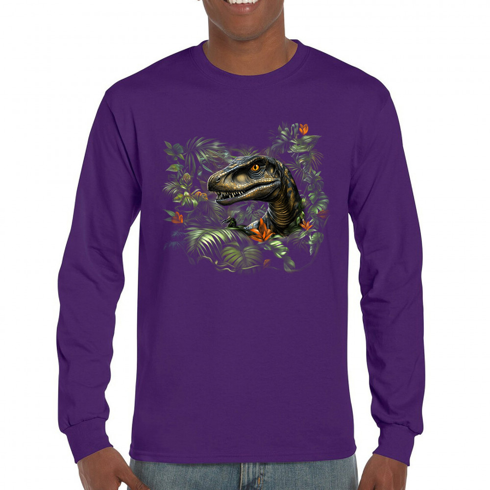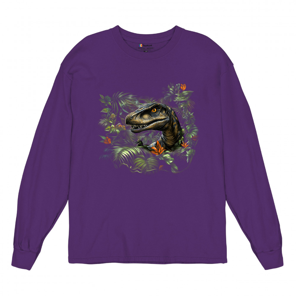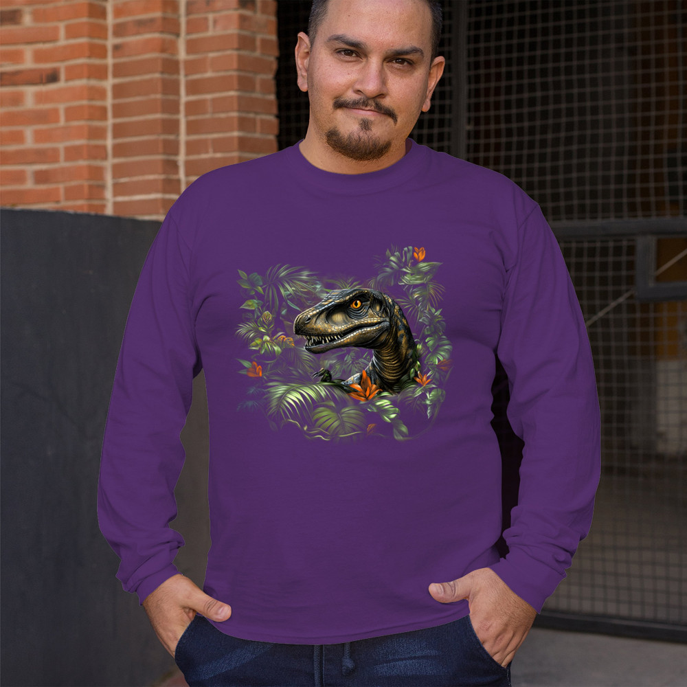 Step into the wild with this striking jungle raptor design. A highly detailed velociraptor peeks from vivid tropical foliage and flowers, perfect for dinosaur lovers, fossil fans, and ancient creature enthusiasts. Whether for Jurassic adventures, museum trips, or themed events, this design unleashes untamed prehistoric energy.
