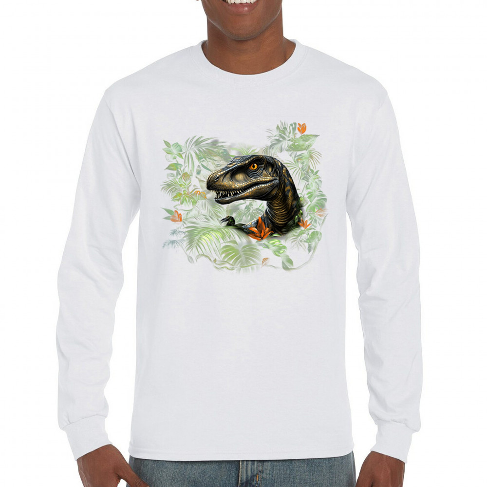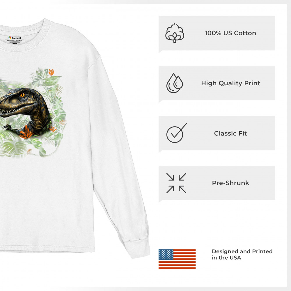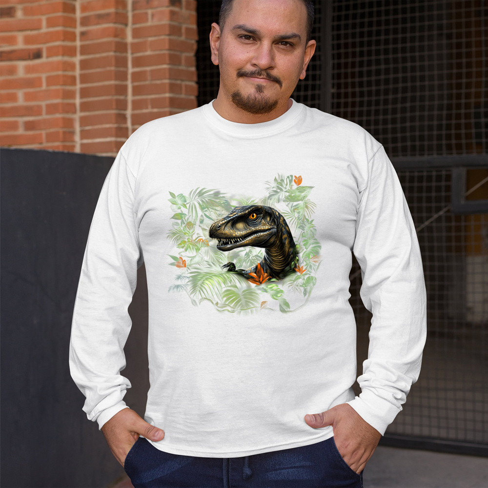 Step into the wild with this striking jungle raptor design. A highly detailed velociraptor peeks from vivid tropical foliage and flowers, perfect for dinosaur lovers, fossil fans, and ancient creature enthusiasts. Whether for Jurassic adventures, museum trips, or themed events, this design unleashes untamed prehistoric energy.