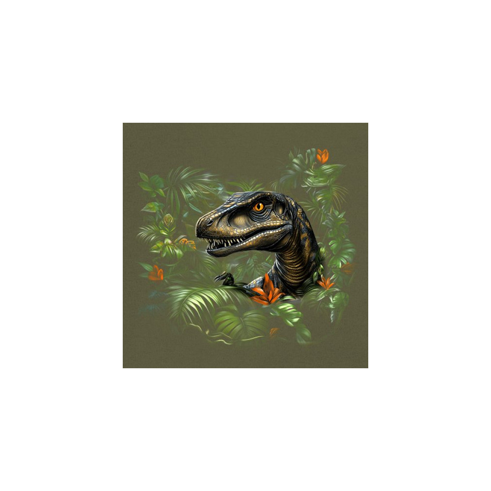 Step into the wild with this striking jungle raptor design. A highly detailed velociraptor peeks from vivid tropical foliage and flowers, perfect for dinosaur lovers, fossil fans, and ancient creature enthusiasts. Whether for Jurassic adventures, museum trips, or themed events, this design unleashes untamed prehistoric energy.