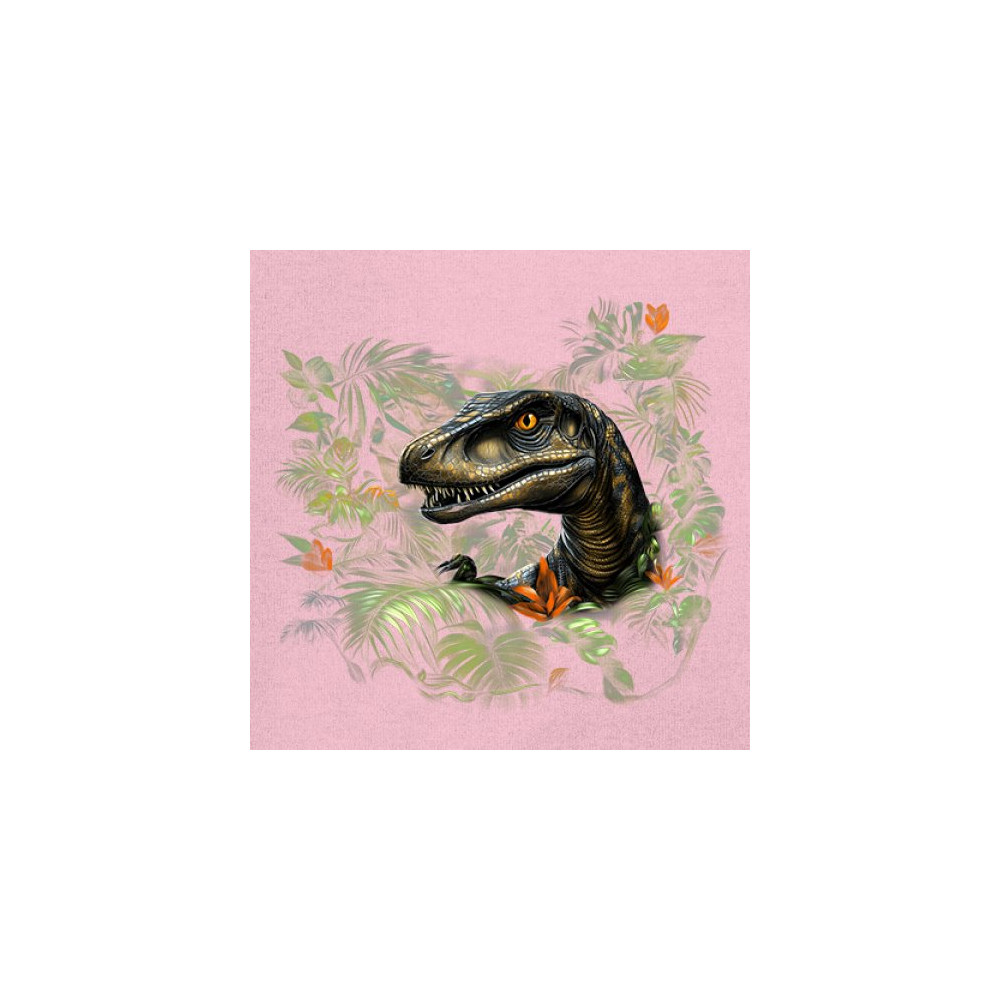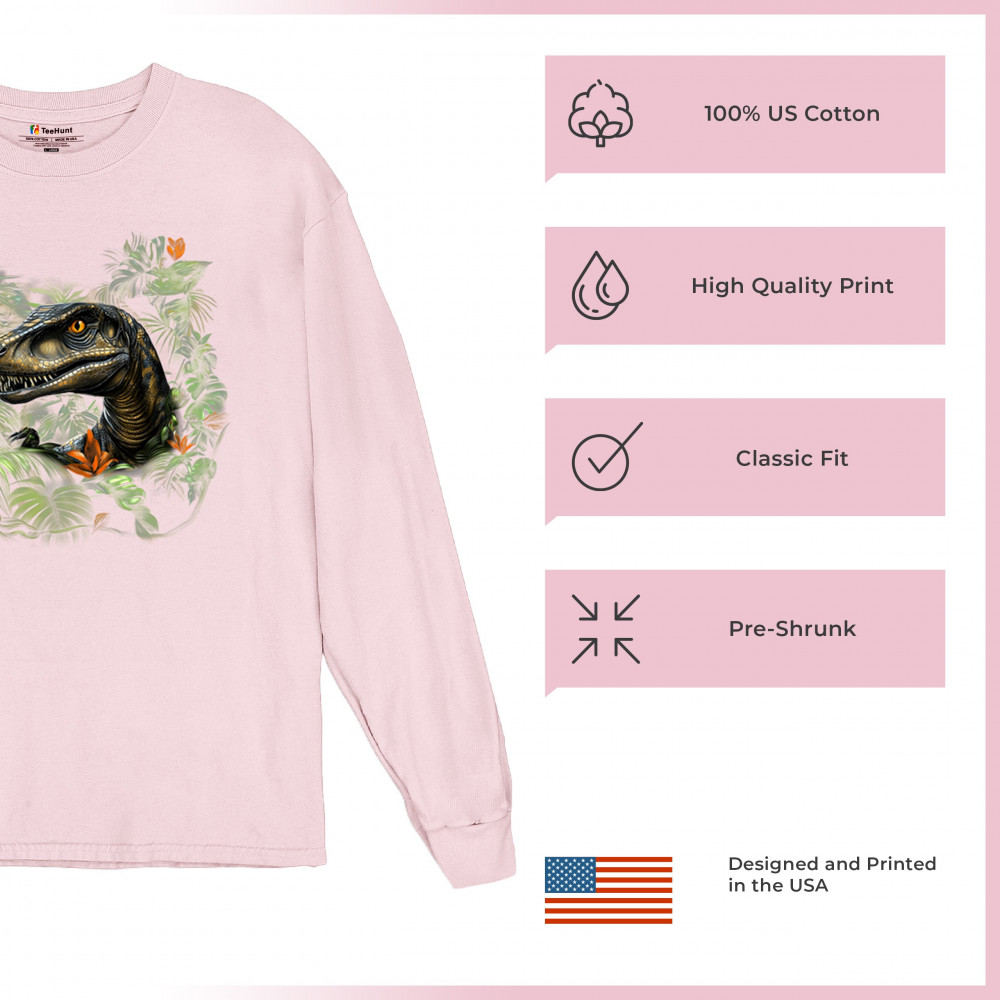Step into the wild with this striking jungle raptor design. A highly detailed velociraptor peeks from vivid tropical foliage and flowers, perfect for dinosaur lovers, fossil fans, and ancient creature enthusiasts. Whether for Jurassic adventures, museum trips, or themed events, this design unleashes untamed prehistoric energy.
