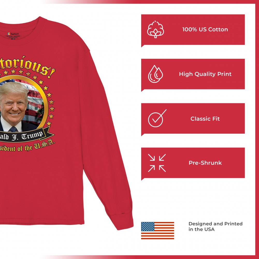 The "Victorious" design captures the spirit of Donald J. Trump’s victory as the 47th President, embodying the pride and patriotism of true American supporters. With elements of the American flag and an inspiring message, it’s a perfect symbol for Republicans, conservatives, and America First advocates. Celebrate the Red Wave and stand for a strong, united nation. Perfect for showing support at rallies, gatherings, or casual wear.